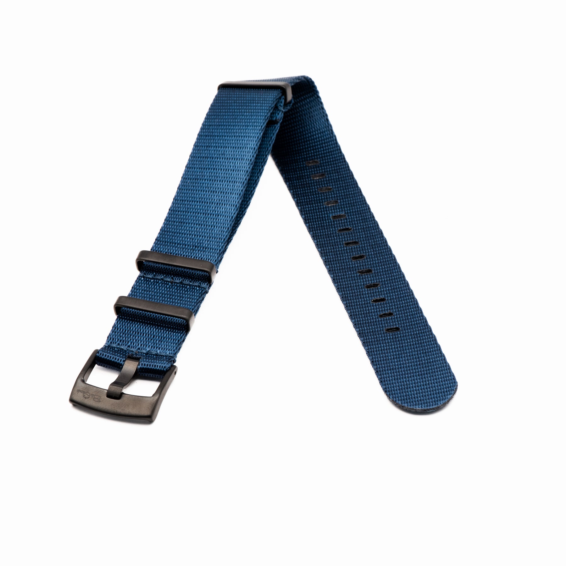 Our luxury nylon watch strap, AlphaShark, in solid navy blue. Crafted from high tensile strength "seat belt" nylon webbing with deluxe hardware, including a premium stainless steel buckle and flat stainless steel keepers. The nylon is weaved to provide a softer feel with a higher sheen than standard nylon straps. Superior to standard nylon straps, the AlphaShark, is comparable to far more expensive offerings.