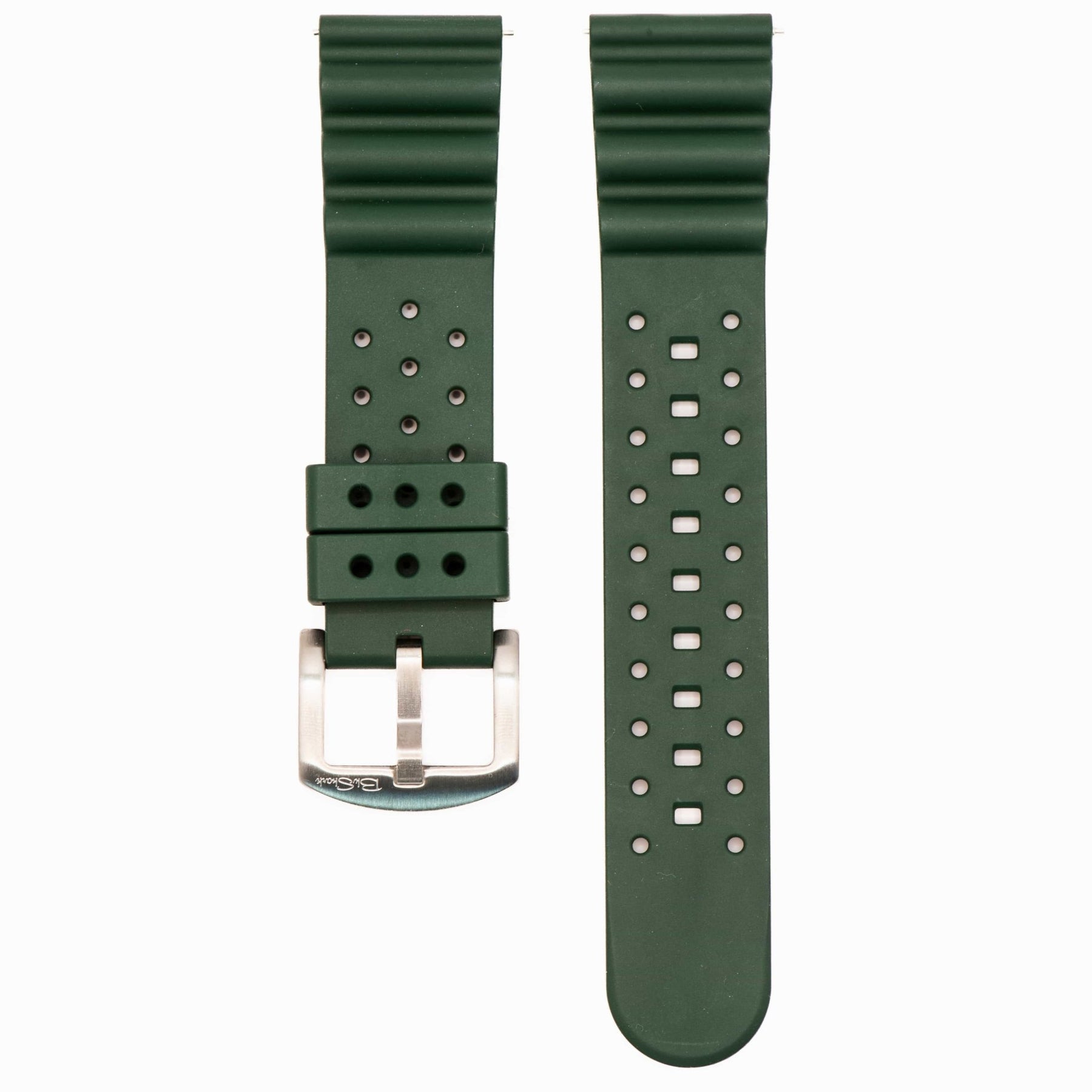 This strap "sports" perforations for airflow and accordion styling at the lugs to ensure a perfect fit during any activity.  It measures 2.8mm at the lug connection and two sliding rubber keepers keep everything in place.