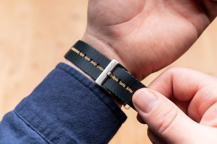 OurĀ luxury nylon watch strap, AlphaShark, Naval, features a deep blue with a khaki stripe. Crafted from high tensile strength "seat belt" nylon webbing with deluxeĀ hardware, including a premium stainless steel buckle andĀ flat stainless steel keepers. The nylon is weaved to provide aĀ softer feel with a higherĀ sheen than standard nylon straps.Ā Superior to standardĀ nylon straps, the AlphaShark, is comparable to far more expensive offerings.Ā