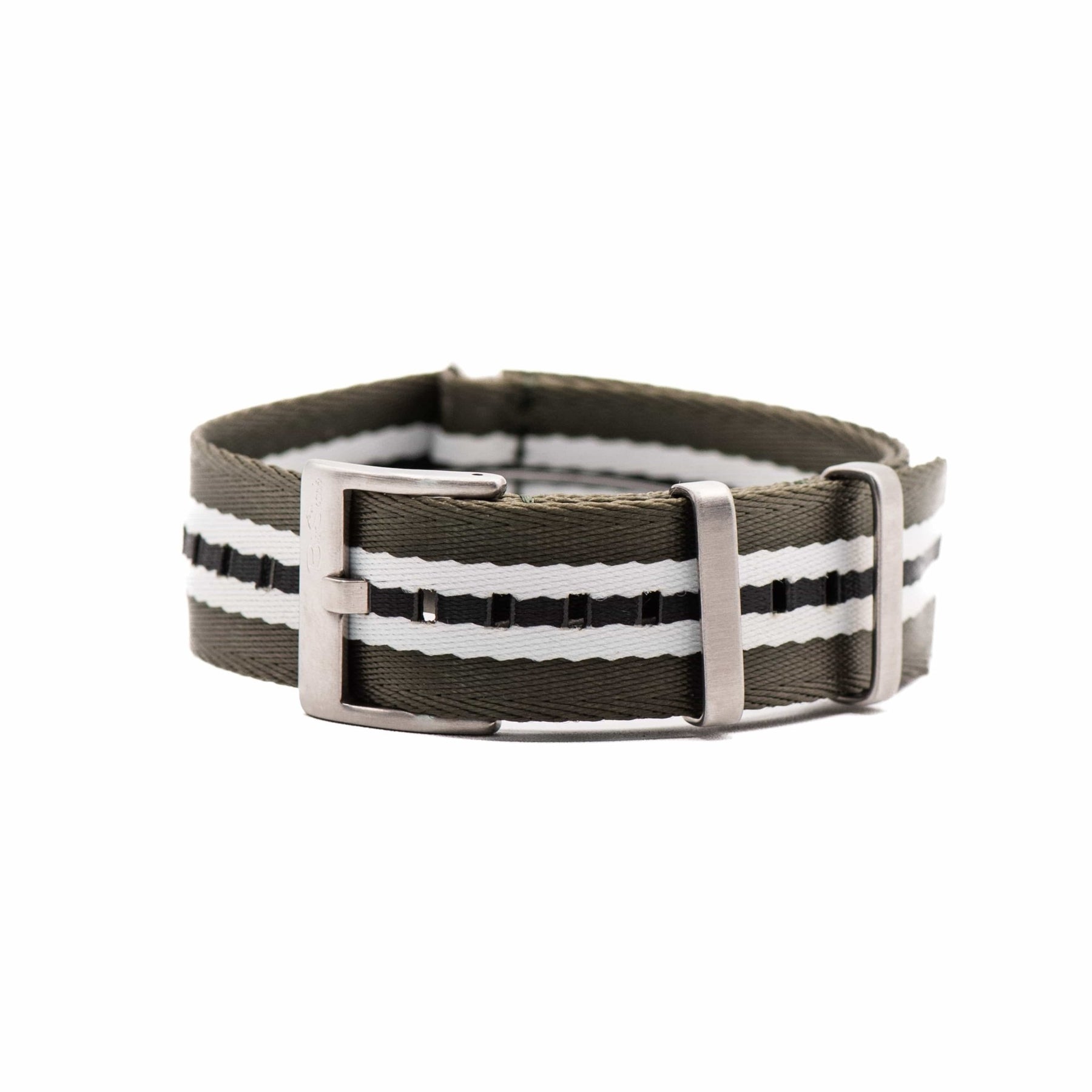 Color Details: The Koala watch strap features a gray base, accented by two crisp white stripes down the middle and a bold black stripe running through the center. The sheen of the nylon, combined with the black and white accents, gives the outer gray a subtle greenish tint when the light hits it just right.