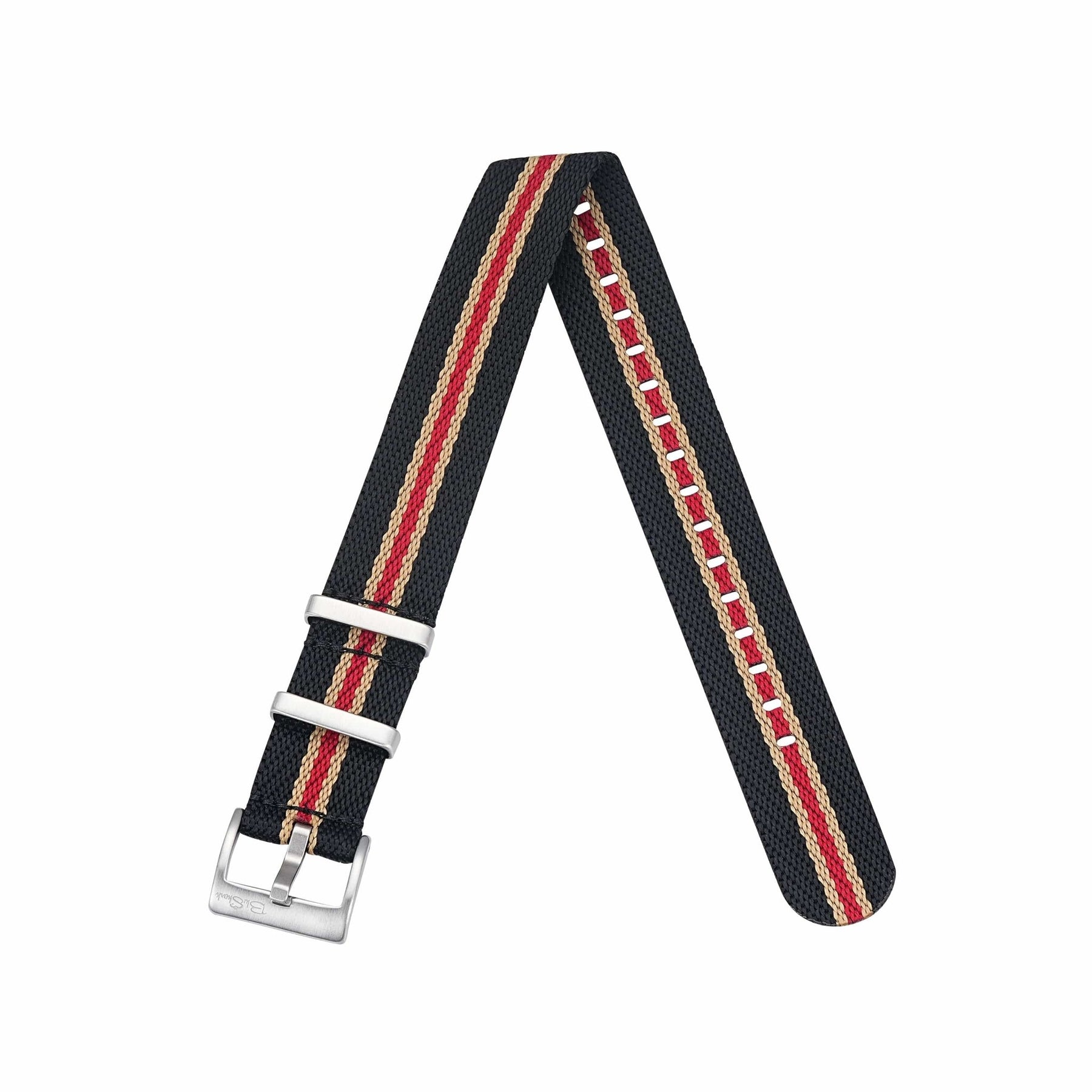 Color Details: The Burnout Black style features three center stripes: the outer stripes are a beige/tan color, and the center stripe is a deep red, framed by solid black edges. Thanks to the twill weave pattern, you can see the black subtly showing through the center stripe, giving this strap added depth.