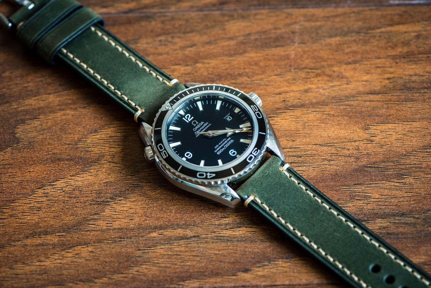 BluShark's Border Stitch watch bands are made of Crazy Horse leather. Crazy Horse is a type of cow leather known for its rugged and distressed appearance that ages especially well. Each band is carefully constructed and adorned with quick-release pins for easy strap changes. The minimalist bands are adorned with an all around border stitch pattern making for a simple, but unique style. As with all of our watch straps, our Leather watch bands are guaranteed to be free of defect for the life of the product.