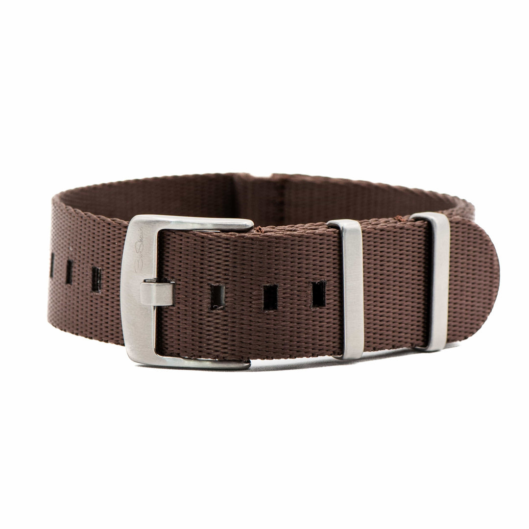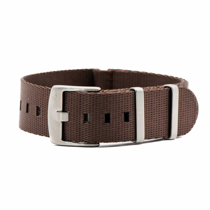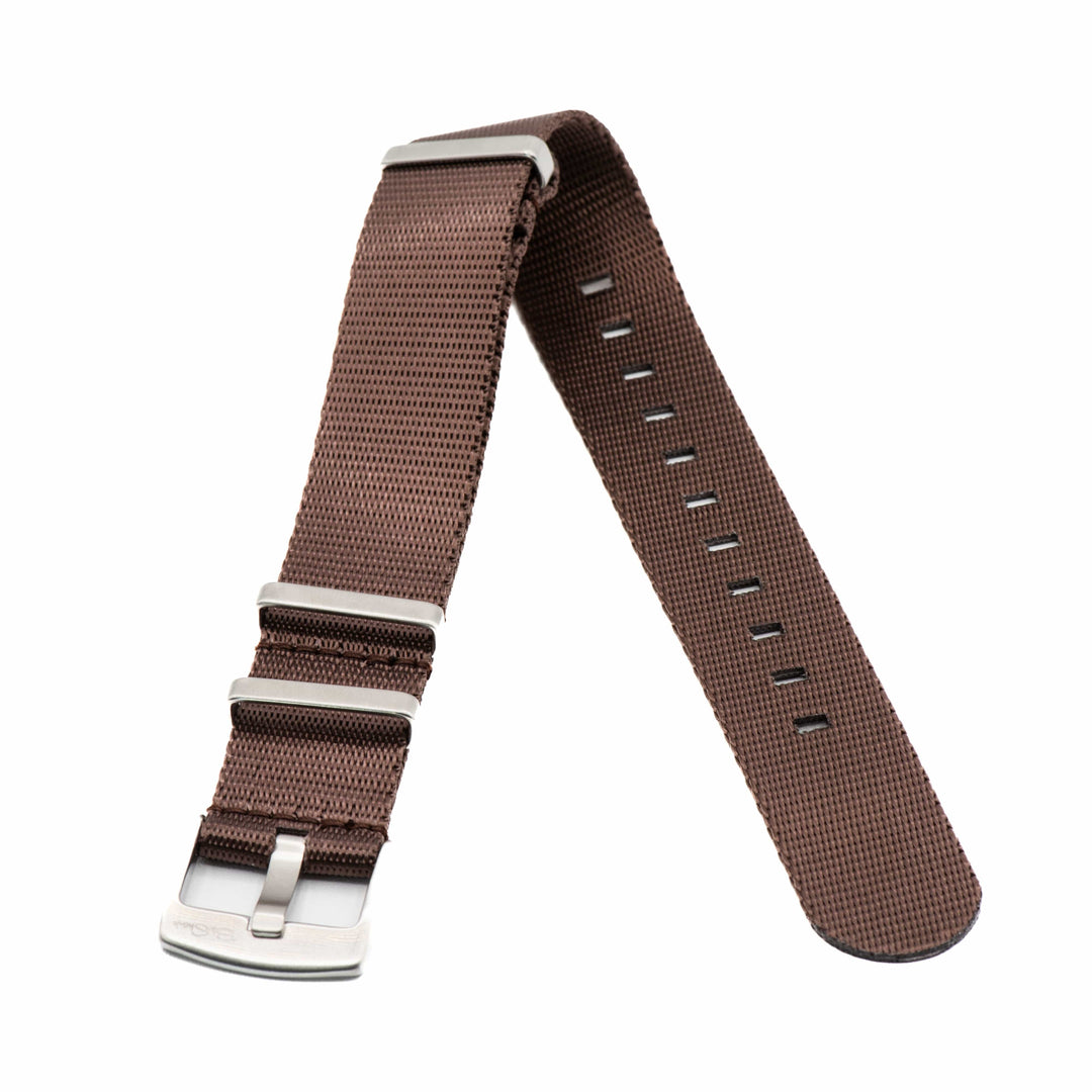 Our luxury nylon watch strap, AlphaShark, in espresso dark brown. Crafted from high tensile strength "seat belt" nylon webbing with deluxe hardware, including a premium stainless steel buckle and flat stainless steel keepers. The nylon is weaved to provide a softer feel with a higher sheen than standard nylon straps. Superior to standard nylon straps, the AlphaShark, is comparable to far more expensive offerings.