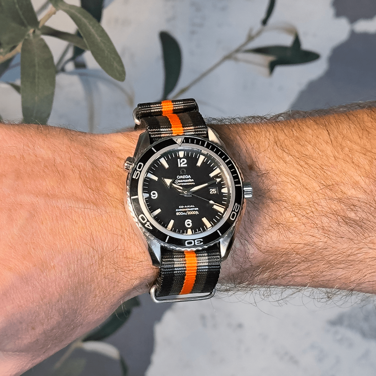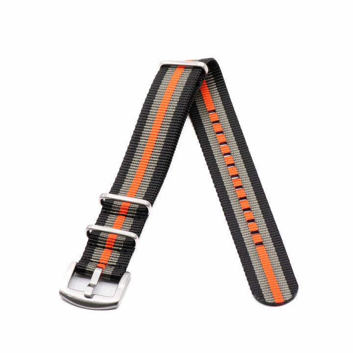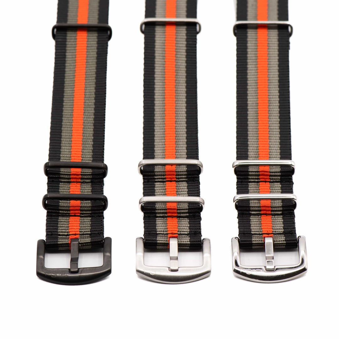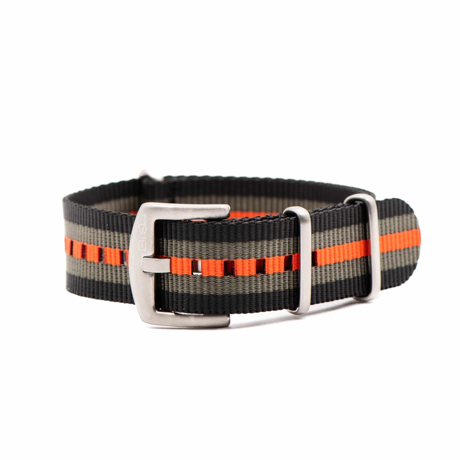 Another variation of our flagship Bond strap, Bond with Orange replaces the middle black stripe of a Bond strap with a bright orange stripe. A classic look while providing enough color, it pairs well with white, silver, and black dials, particularly those with orange accents.  All BluShark straps are cleanly stitched around stainless steel hardware.