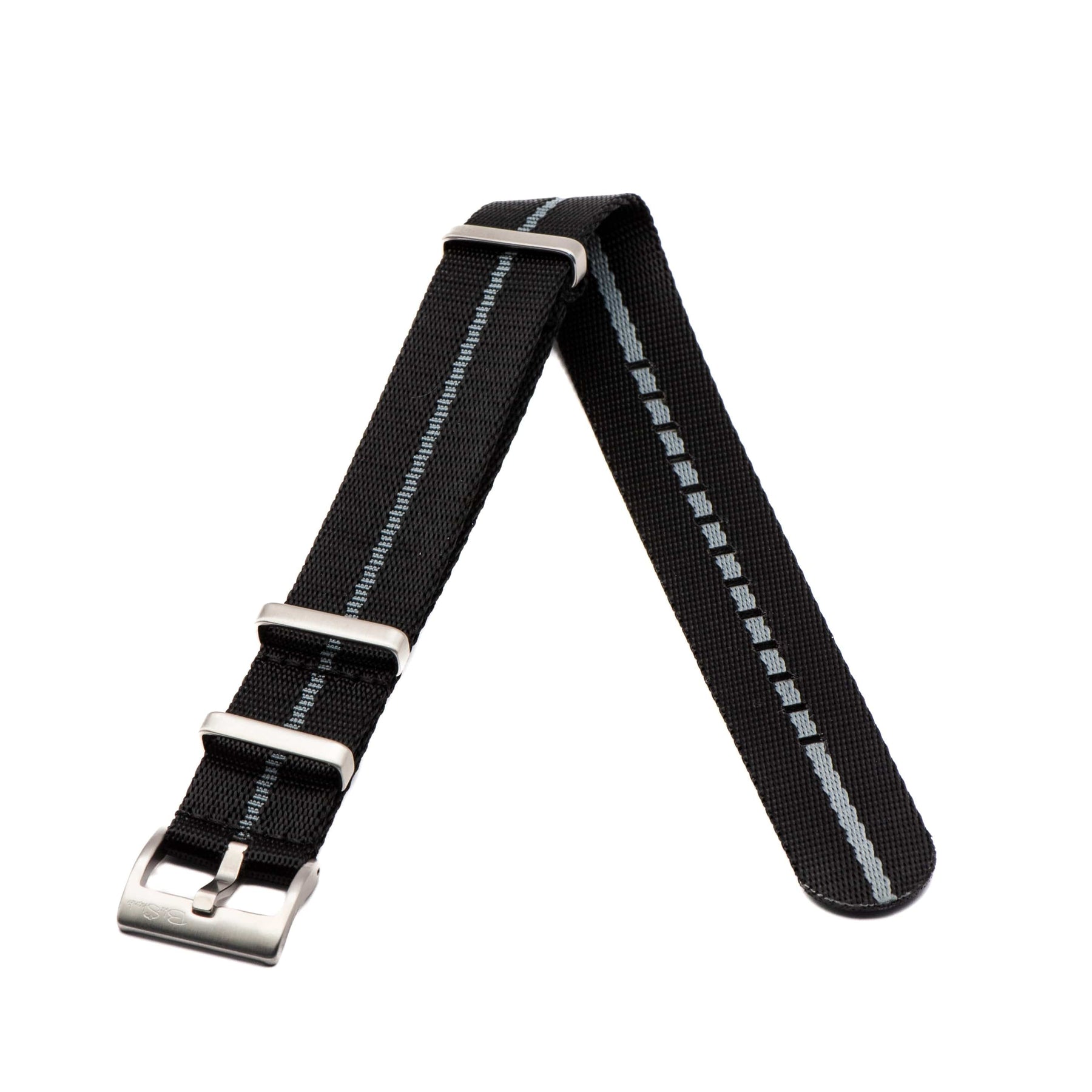 Our luxury nylon watch strap, AlphaShark, in solid black. Crafted from high tensile strength "seat belt" nylon webbing with deluxe hardware, including a premium stainless steel buckle and flat stainless steel keepers. The nylon is weaved to provide a softer feel with a higher sheen than standard nylon straps. Superior to standard nylon straps, the AlphaShark, is comparable to far more expensive offerings.