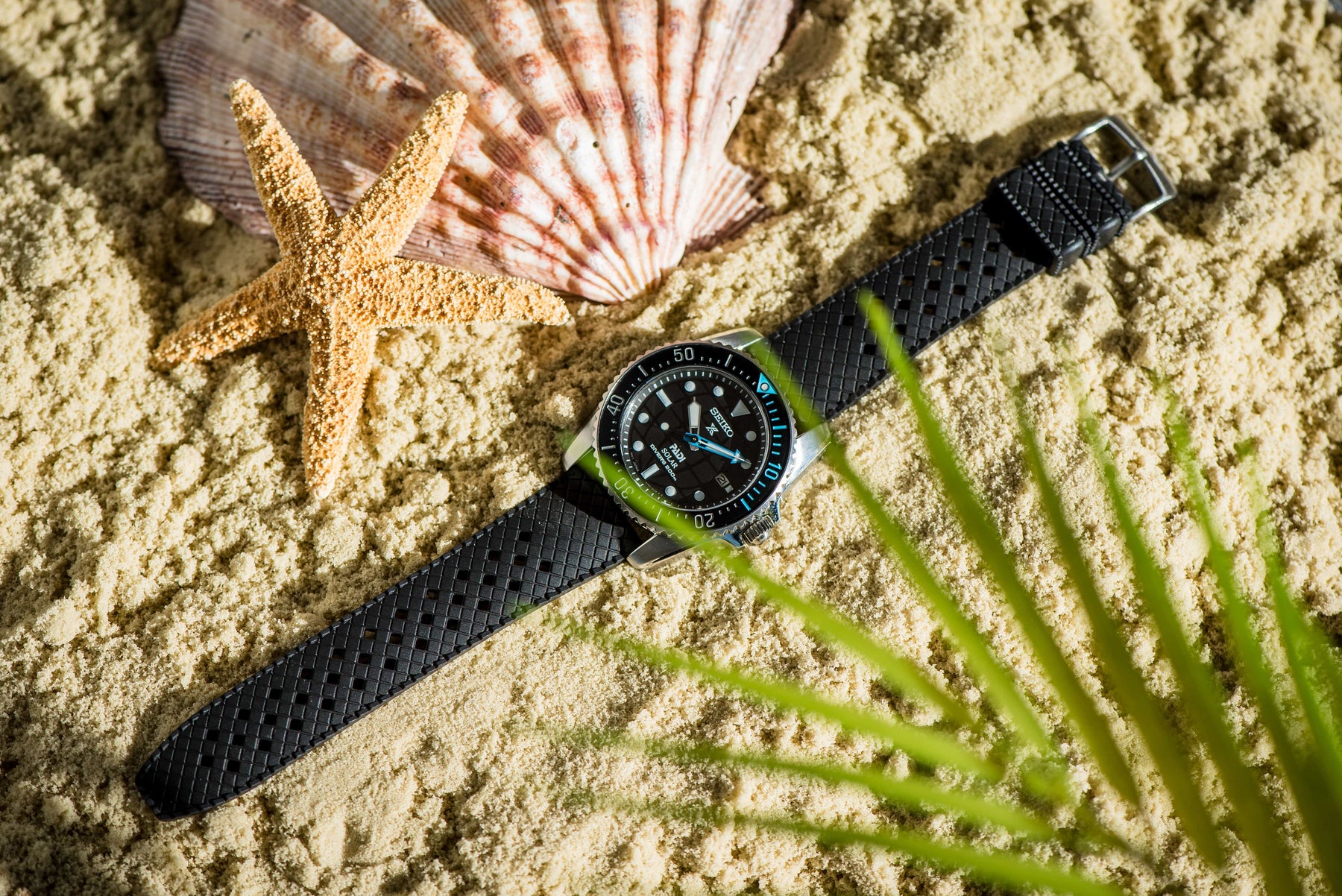 Introducing the Neo Tropical Rubber Strap by BluShark Straps. Featuring a sleek buckle, a flexible feel, and two sliding keepers that match the strap’s design, this strap is a modern take on our classic Tropical Style. The Neo Tropical enhances its predecessor with deeper, diagonal crisscross etching and slightly jagged edges, creating a stronger, more rugged look. It comes with two lengths for a customizable fit—try each to find the one that fits you best.