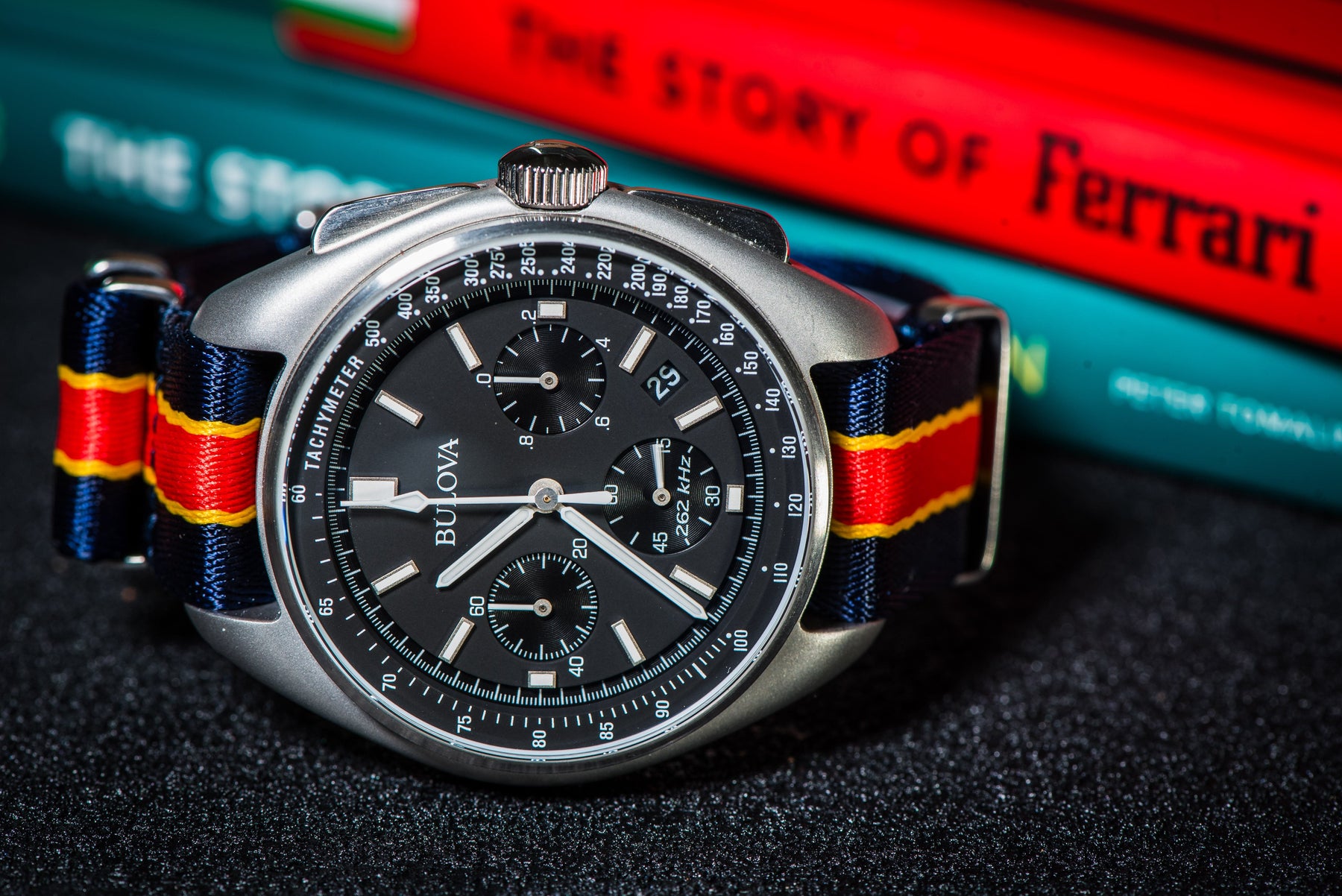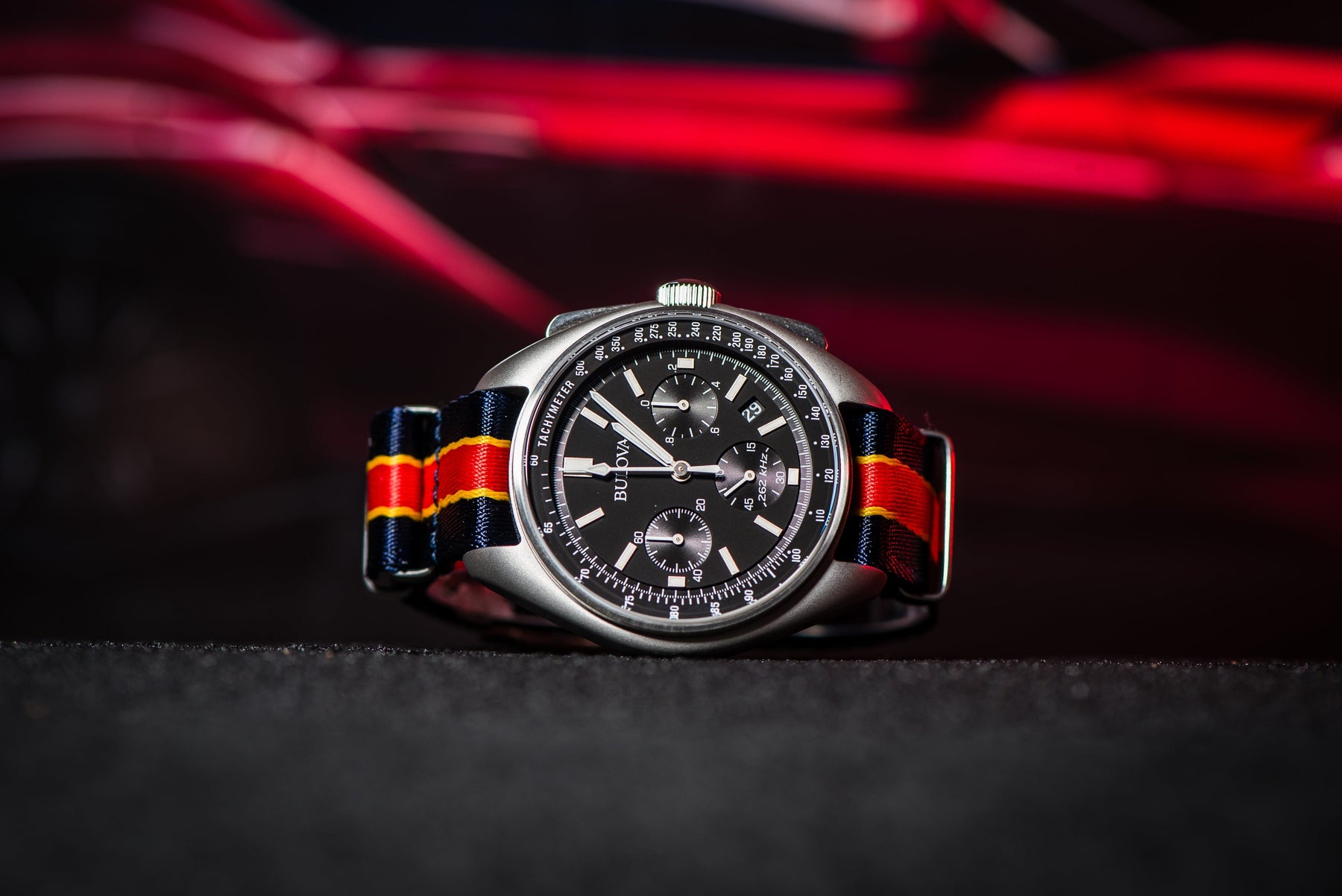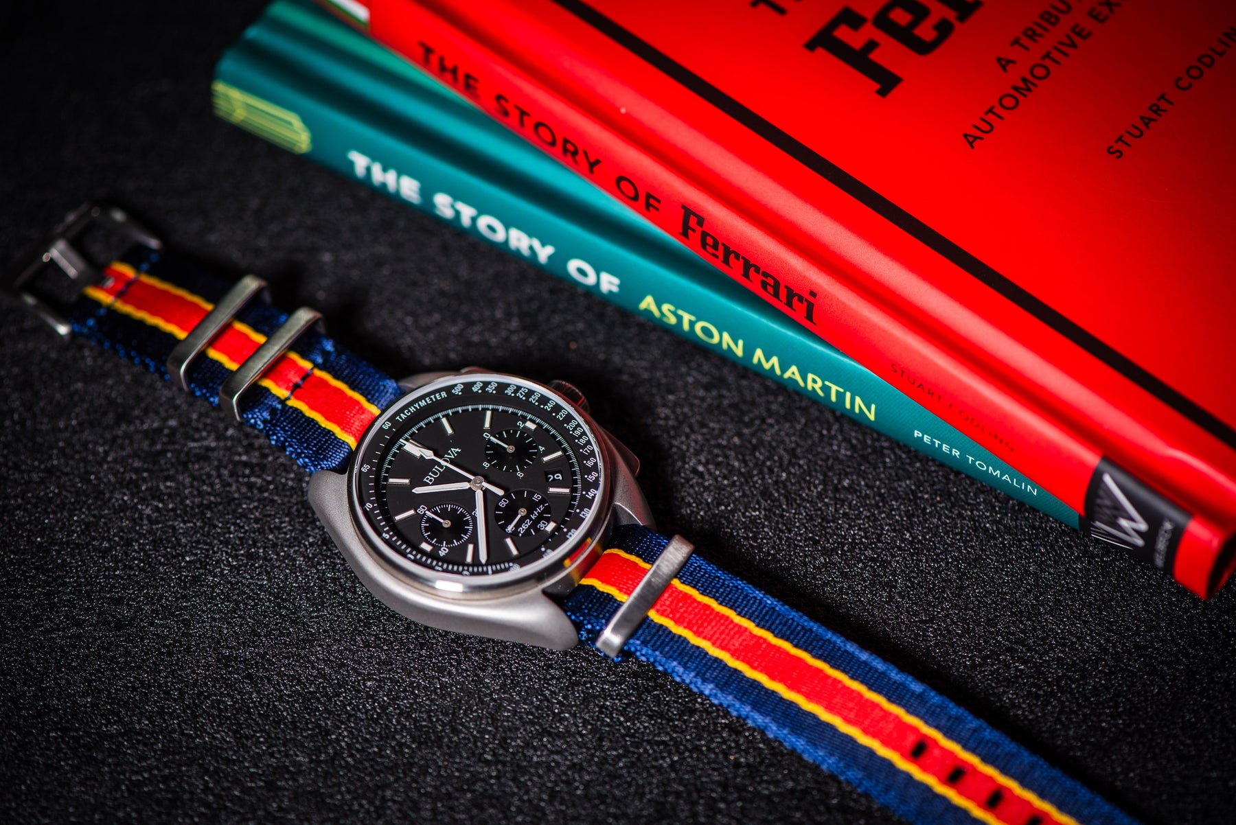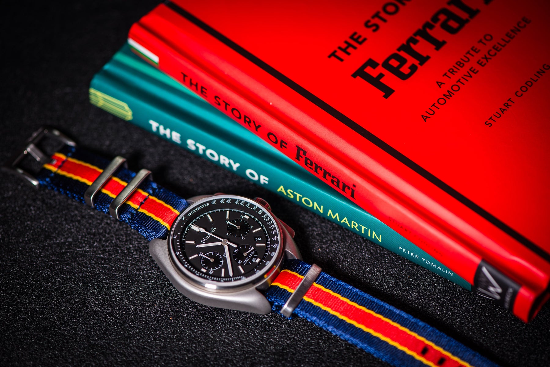 The ticking of a watch echoes the thrill of world-class racing, where winners are decided by tenths of a second. From muscle cars roaring through city streets to Daytona and F1’s global stage, racers have always stood out with bold color accents. Our AlphaPremier Racing Stripe straps capture that spirit with premium nylon and striking racing stripes, perfect for those who value precision, speed, and style both on and off the track.
