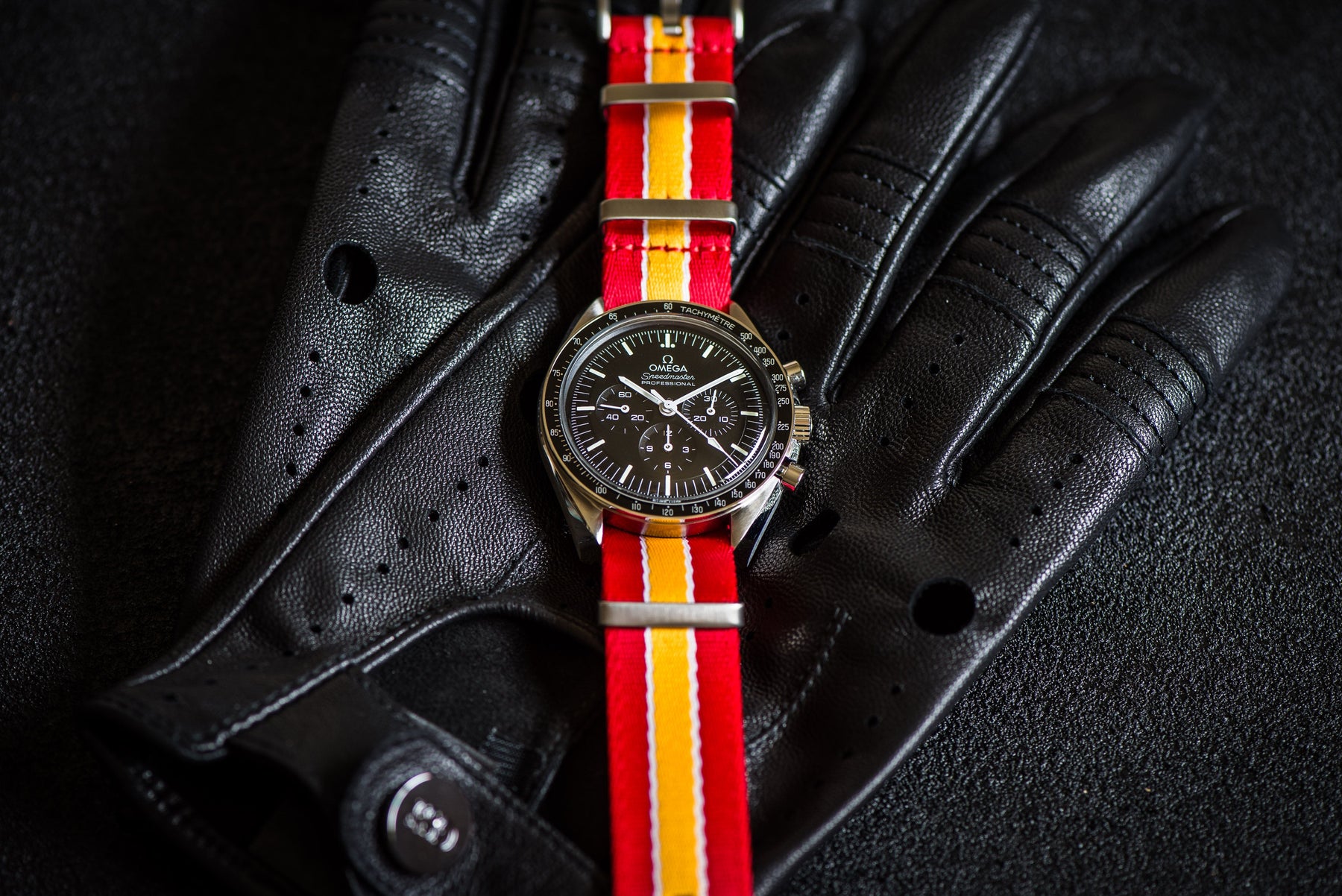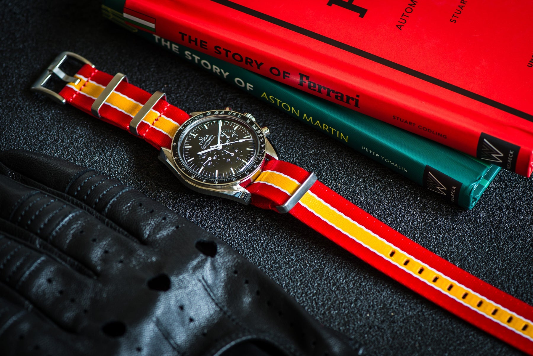 The ticking of a watch echoes the thrill of world-class racing, where winners are decided by tenths of a second. From muscle cars roaring through city streets to Daytona and F1’s global stage, racers have always stood out with bold color accents. Our AlphaPremier Racing Stripe straps capture that spirit with premium nylon and striking racing stripes, perfect for those who value precision, speed, and style both on and off the track.