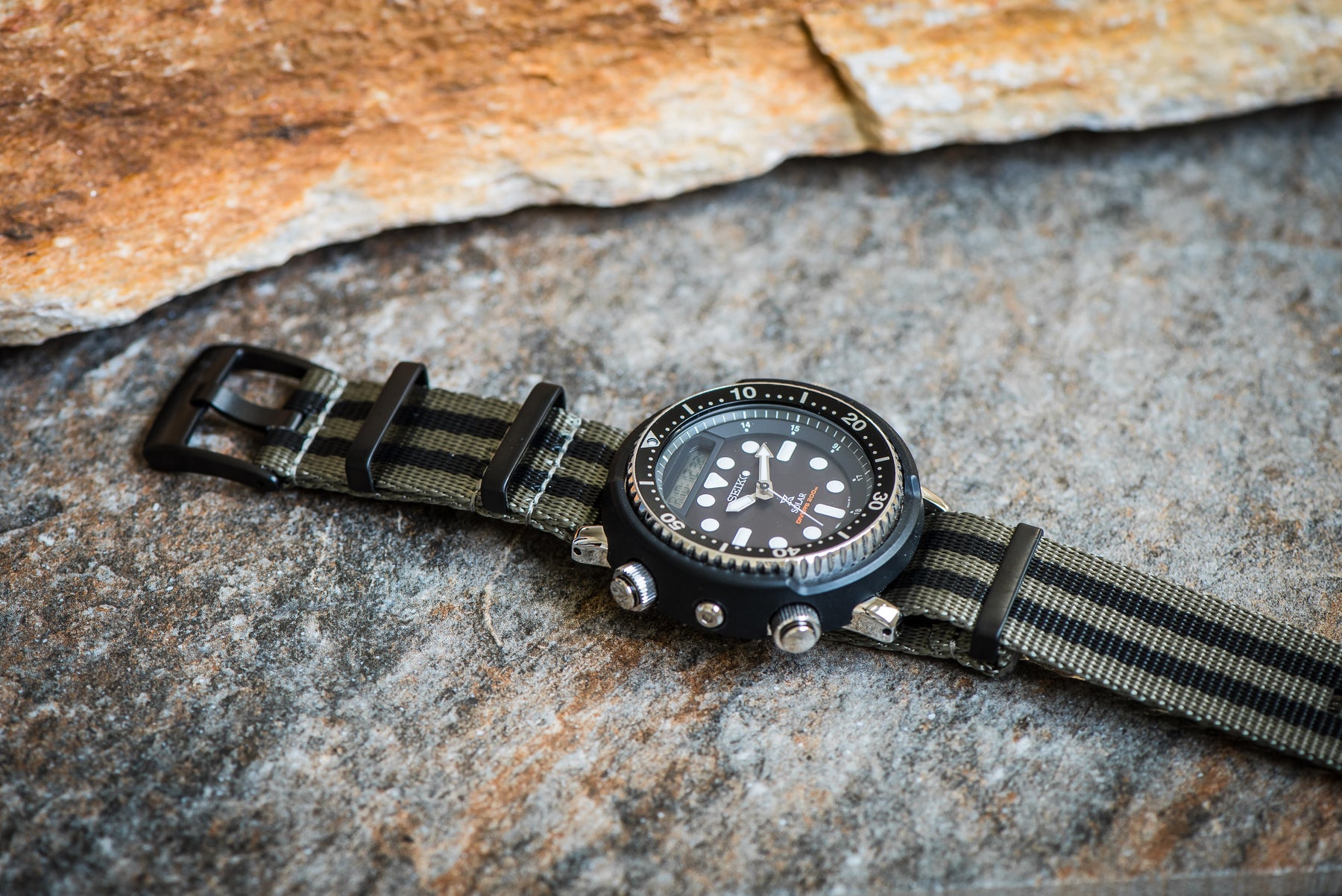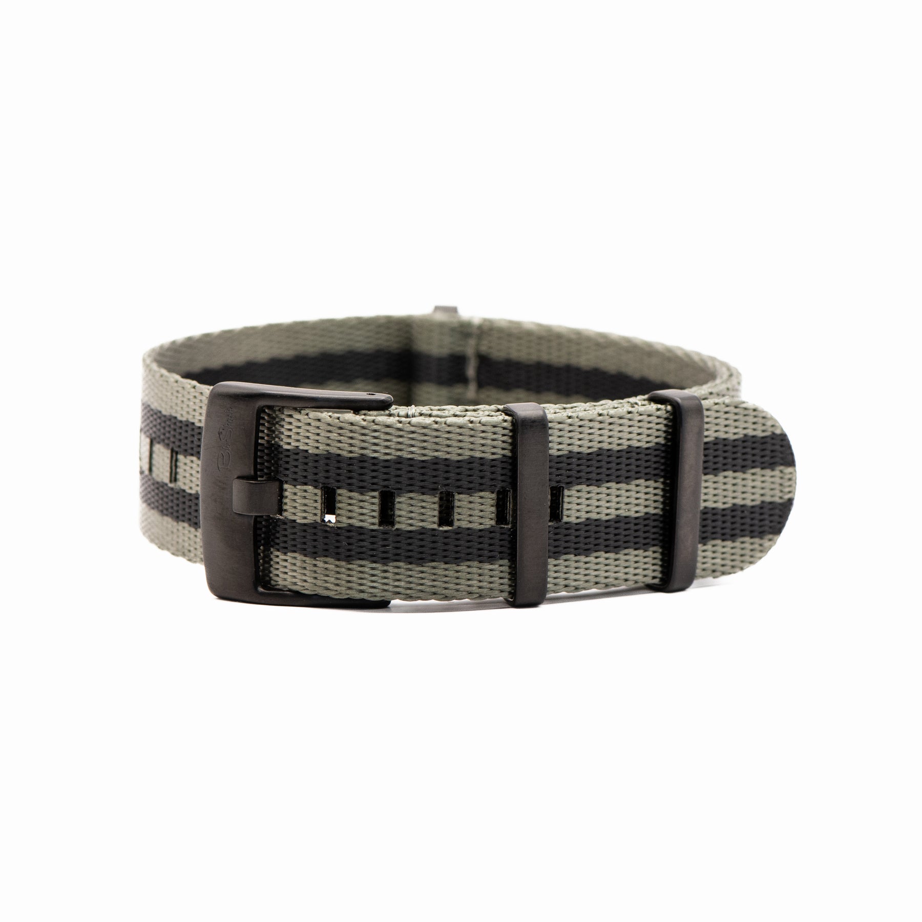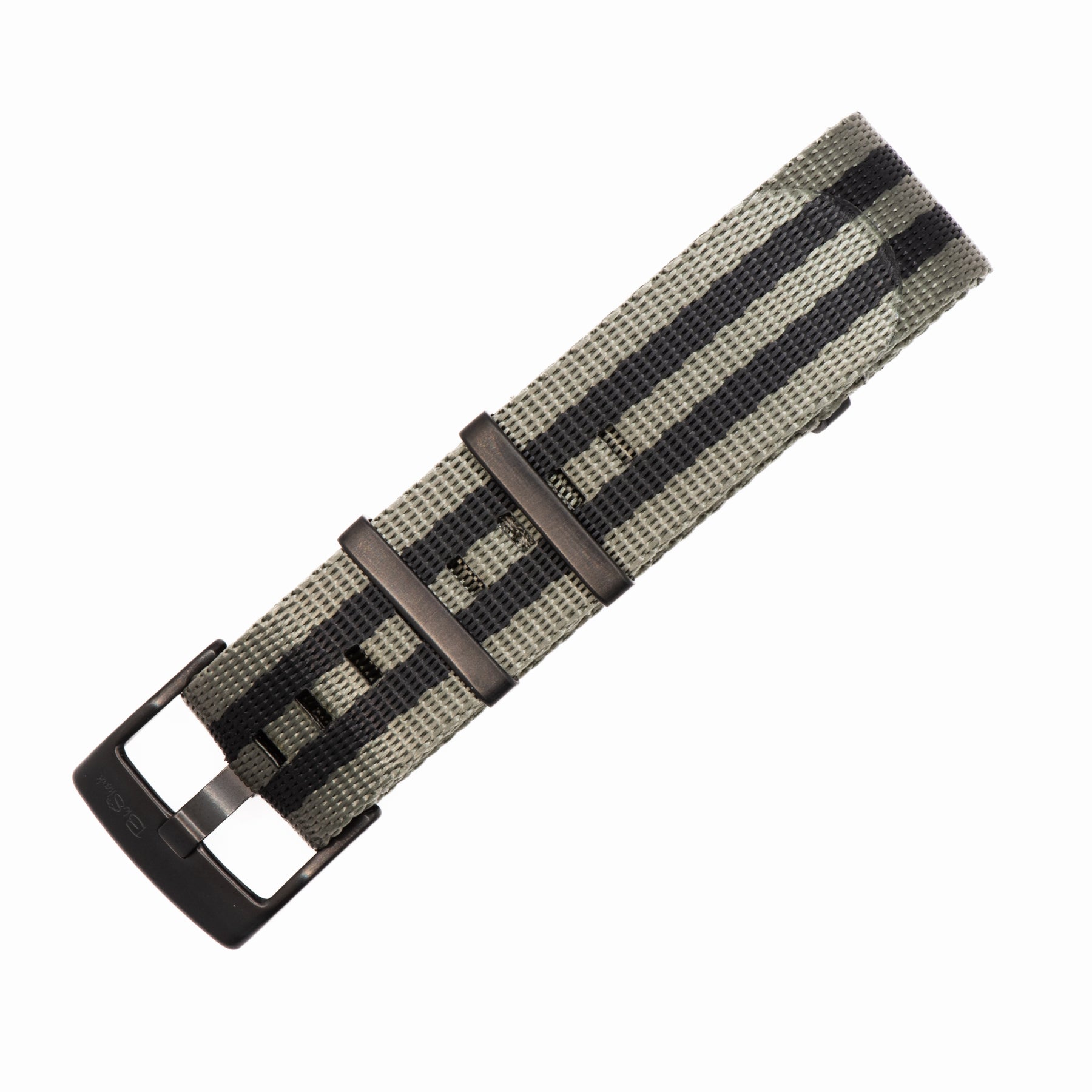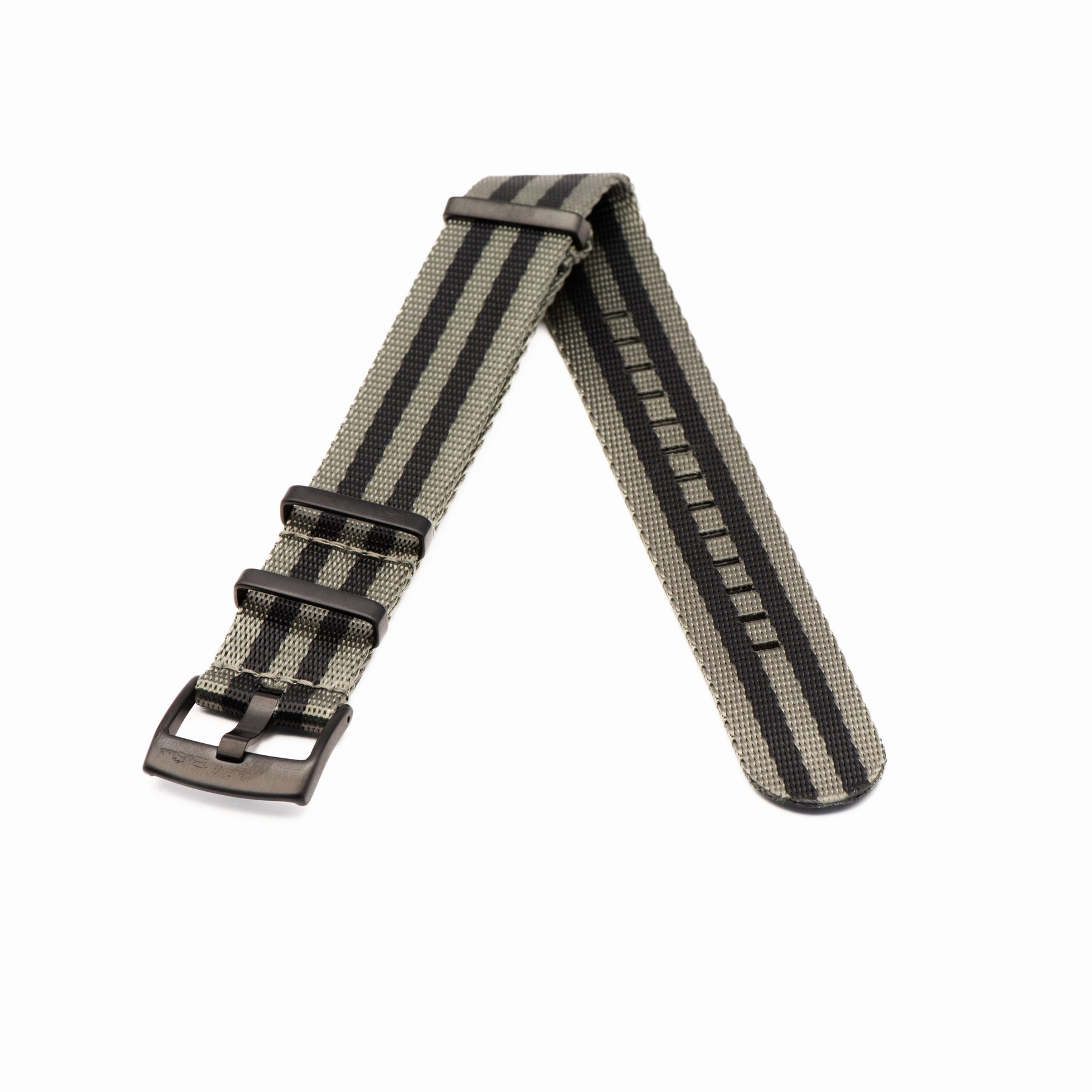 OurĀ luxury nylon watch strap, AlphaShark, in the classic Bond pattern, but with the colors reversed for a twist. Gray is the dominant color of this strap with black stripes.Ā Crafted from high tensile strengthĀ nylon webbing with deluxeĀ hardware, including a premium stainless steel buckle andĀ flat stainless steel keepers. The nylon is weaved to provide aĀ softer feel with a higherĀ sheen than standard nylon straps.Ā Superior to standardĀ nylon straps, the AlphaShark, is comparable to far more expensive offerings.Ā