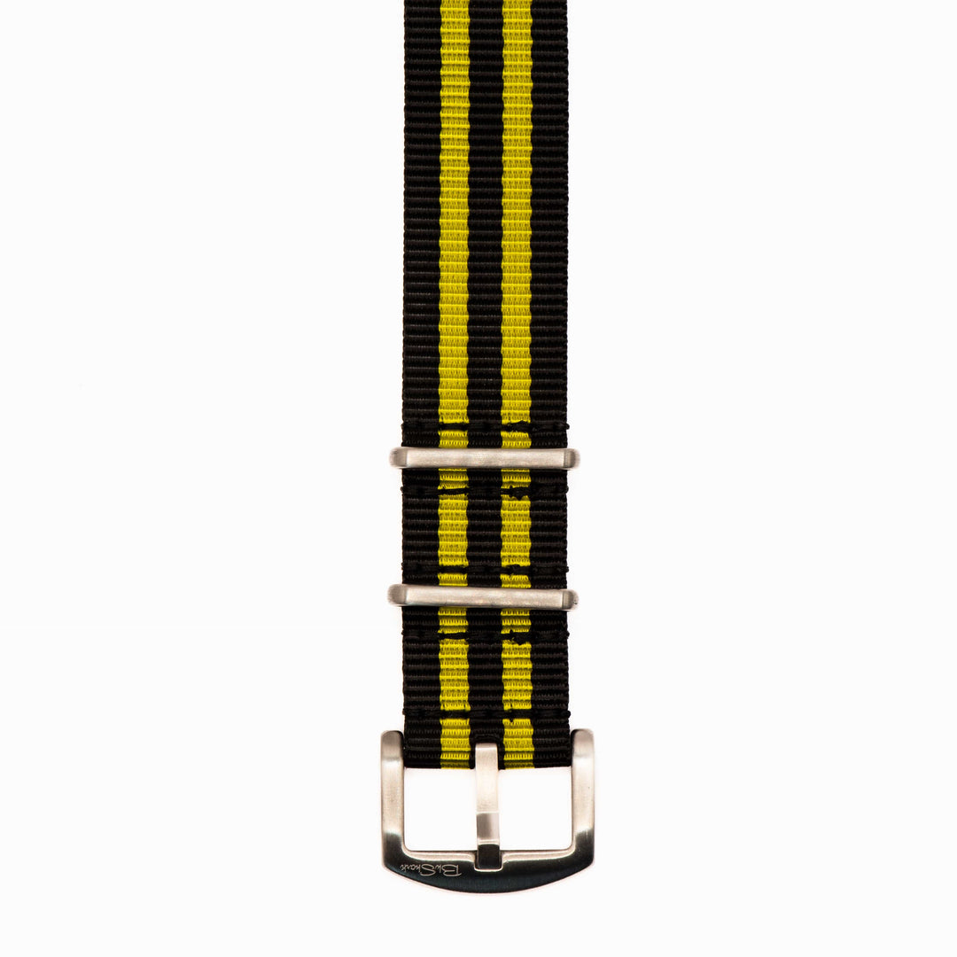 Our Bond - Yellow strap sports a 5-striped pattern similar to our Bond strap, but with the gray stripes swapped out for bold yellow stripes. A great complement for yellow accented watches or to add color to plain black dials.