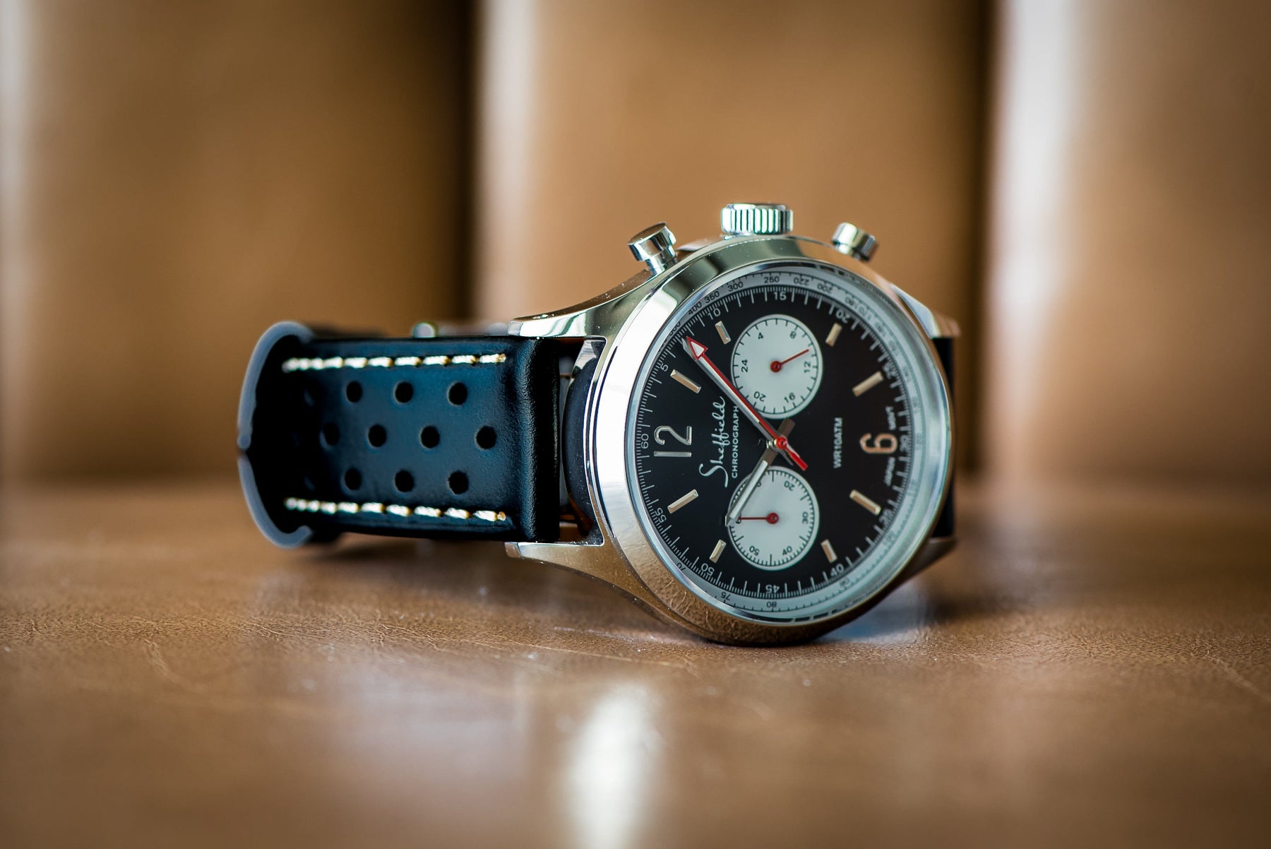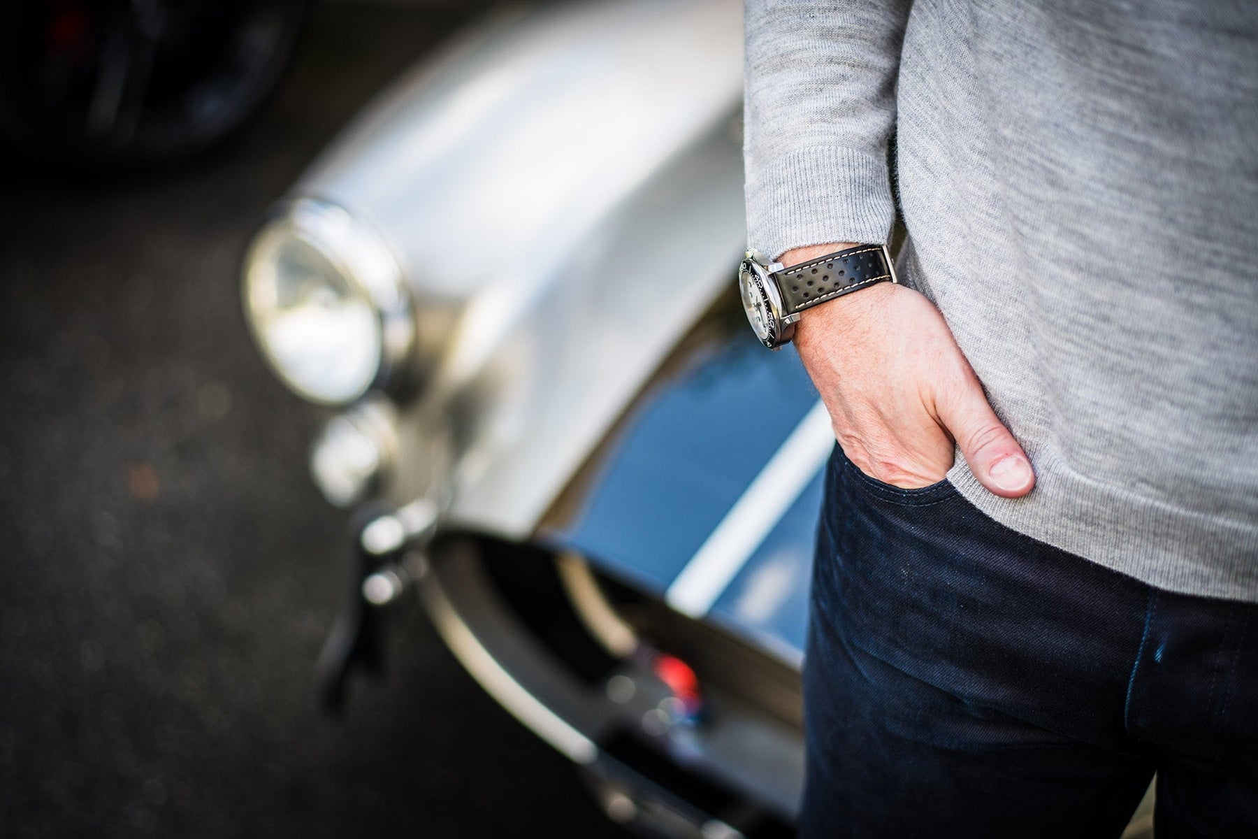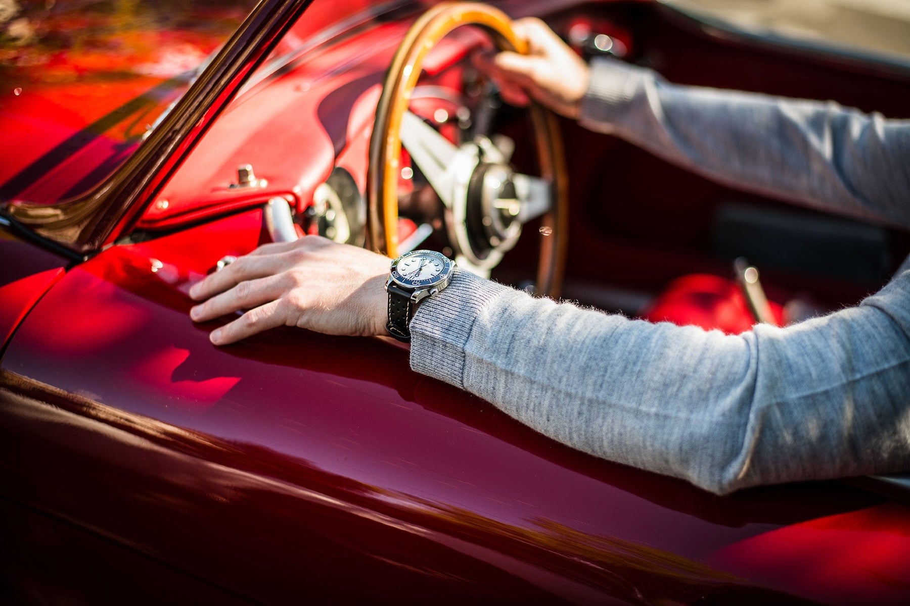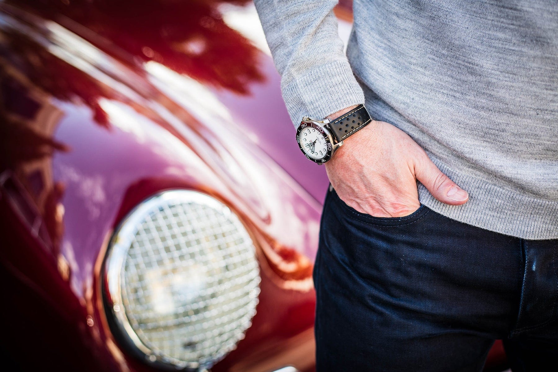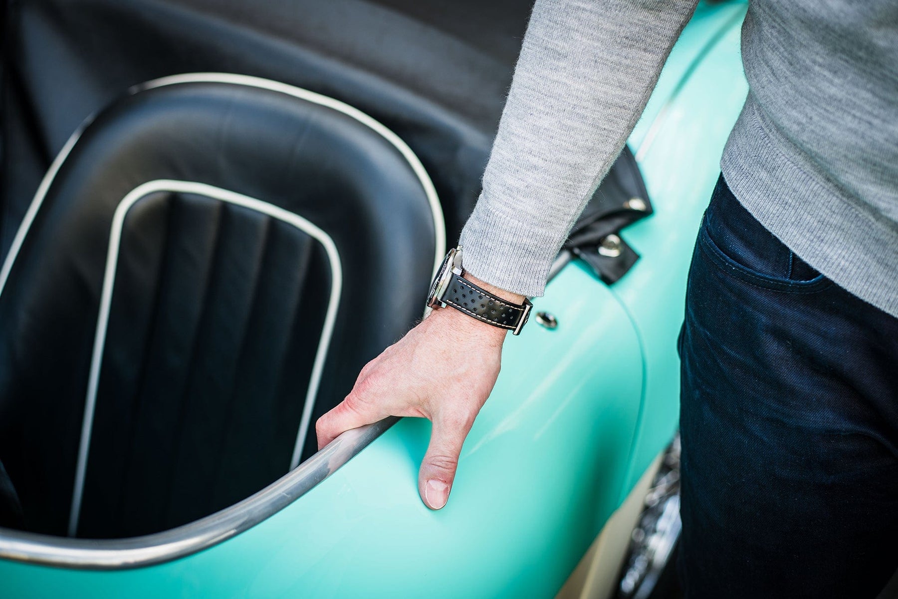 The Leather Sport Grip strap draws inspiration from the leather steering wheel grips of classic cars, crafted with the same precision and timeless style that made those vehicles legendary. We’ve elevated this design with bold contrasting border stitching that enhances its sporty character. Perforated holes along the strap improve airflow, helping keep your wrist cool and dry. For durability, the strap features two keepers, one fixed and one sliding, secured with reinforced stitching. And just like the stainless-steel details on those vintage steering wheels, it’s finished with our premium brushed stainless steel BluShark buckle, or for an even sportier edge, a PVD buckle option.