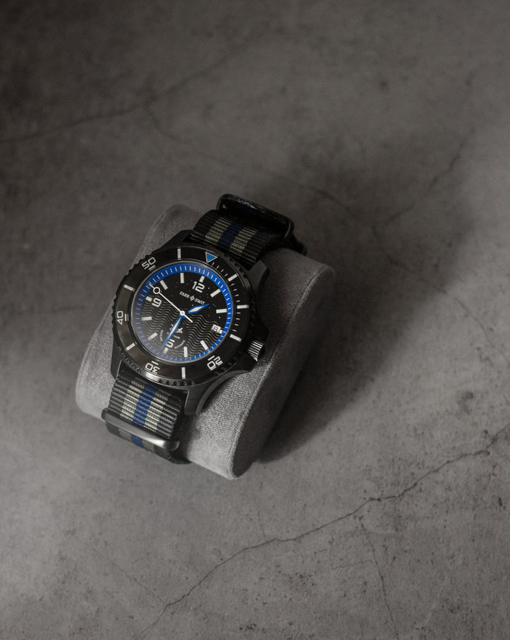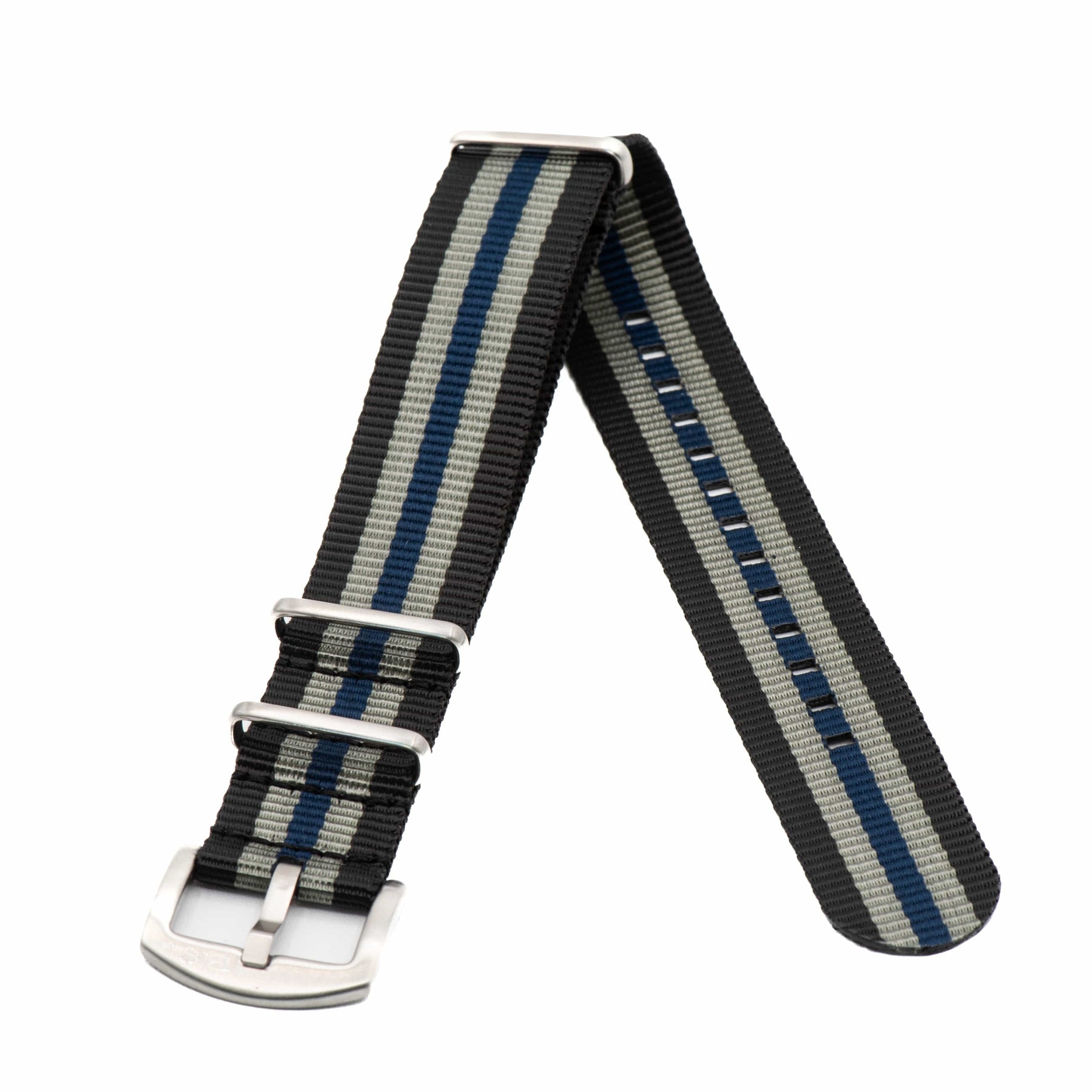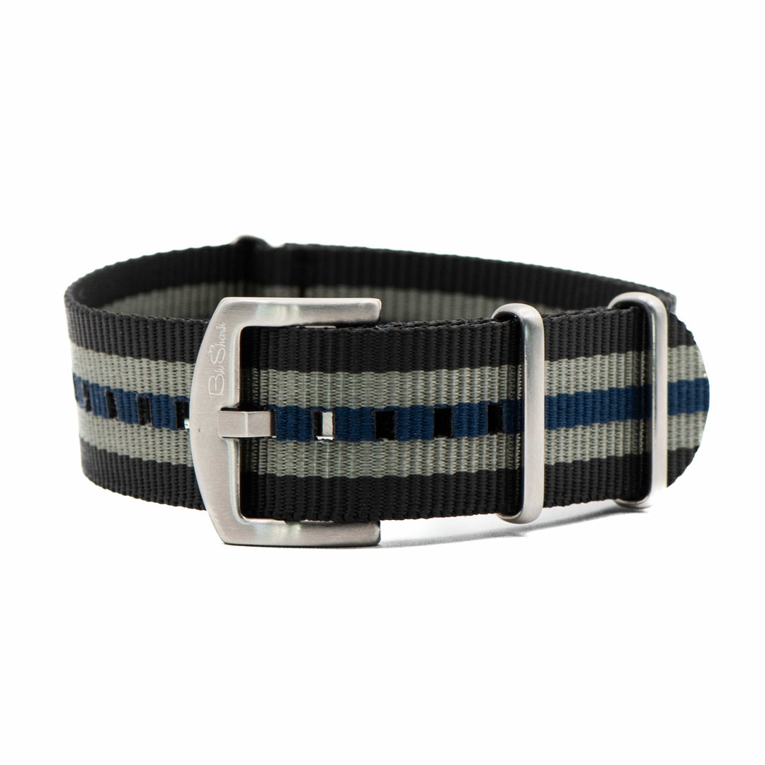 Our Bond with Blue strap sports the same 5-striped pattern as our Bond strap, but with the middle black stripe swapped out for blue. A lovely alternative to the traditional Bond strap, it goes well with blue dial watches.
