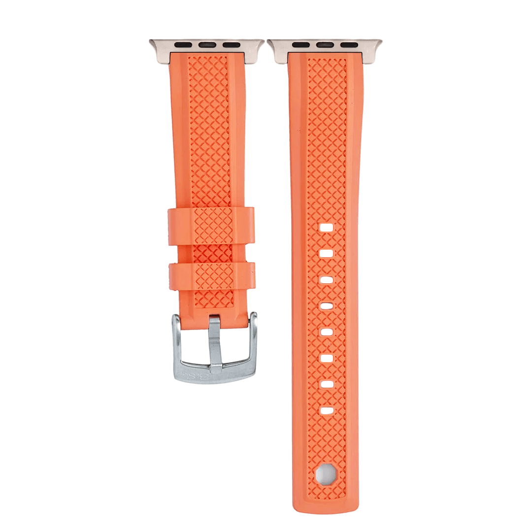 Waffle Rubber: Inspired by Seiko's 1960s ZLM01 Waffle strap, our Waffle style reimagines this vintage dive watch band. Super soft, flexible, and sweat-proof for everyday use. Features two sliding rubber keepers, with the first keeper lockable. Crafted from durable FKM rubber in vibrant orange, sized at 130x80mm. Includes double floating rubber keepers, a brushed stainless steel buckle, and quick-release pins for easy changes.
