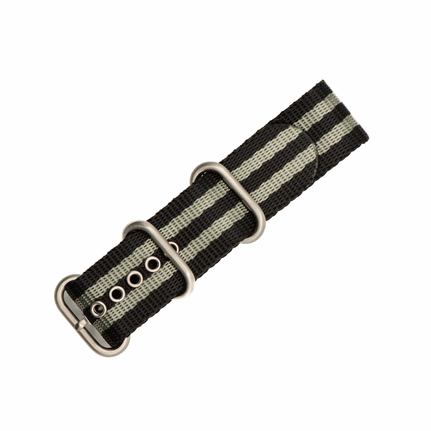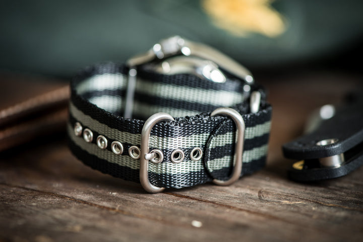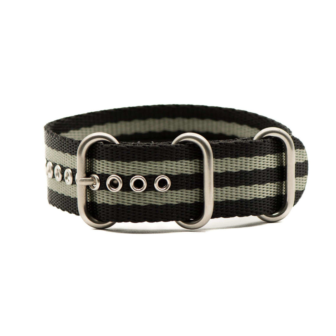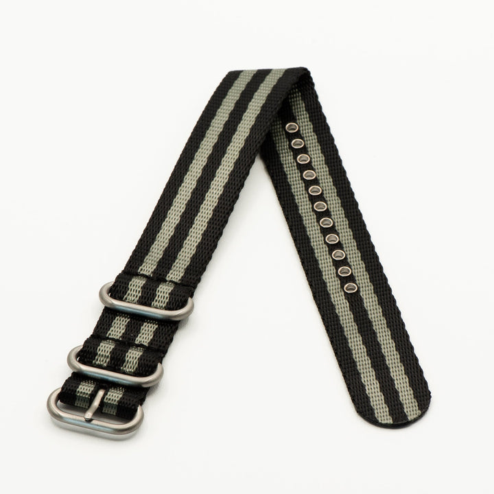 The strap itself is made from our AlphaShark nylon which features 1.4mm thick high tensile strength "seat belt" webbing. Steel ring buckle and keepers are double-stitched on the strap resulting in a never-fail construction. Strap holes are reinforced with metal grommets for a durable connection. It's our most rugged and durable strap yet - we can't wait for you to try it out and put it to the test.