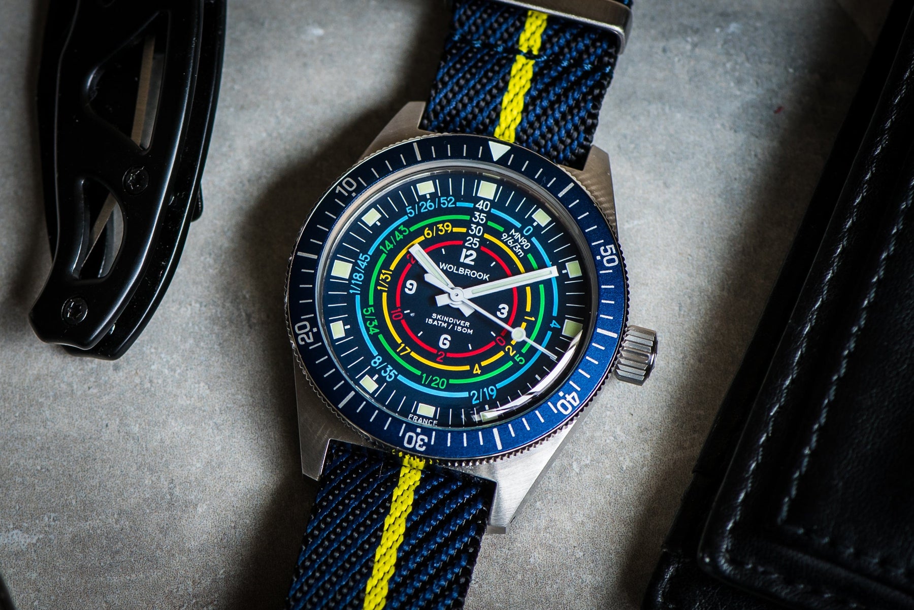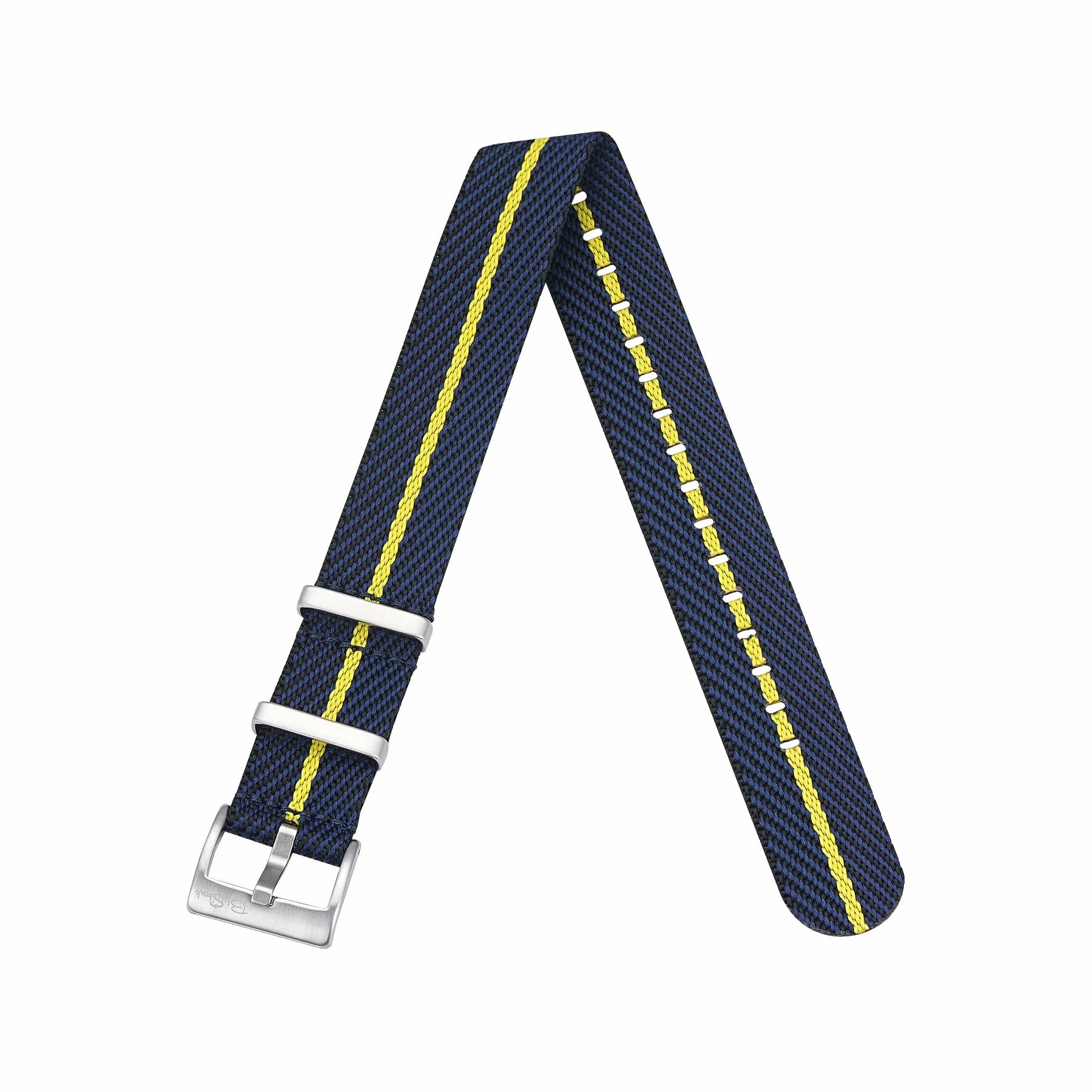 Color Details: The Space & Yellow style features a bold yellow center stripe, framed by black and deep navy blue outer edges in a diagonal twill weave. Thanks to the twill pattern, the black subtly shows through the center stripe, giving this strap added depth.