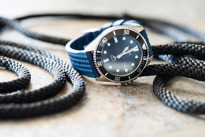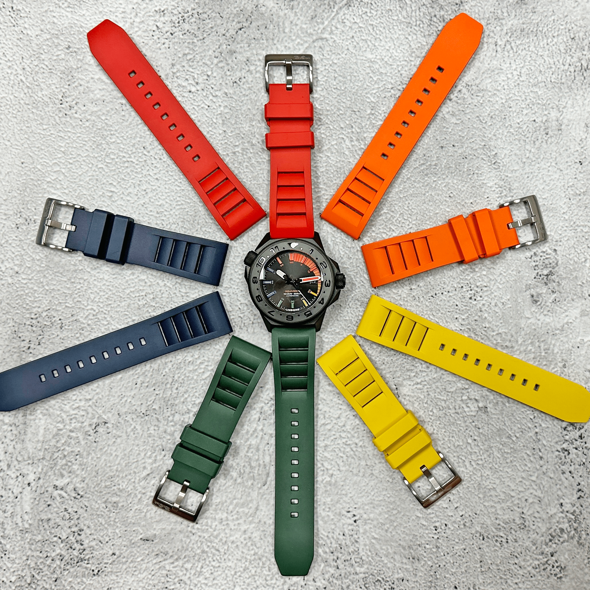 Leather & Rubber: Sleek two-tone design with a black rubber strap body and colored leather top. Tapers 2mm from the watch case to the buckle, with double floating rubber keepers and a choice of black PVD steel or brushed stainless steel buckles. Quick-release pins for easy changes, available in various colors.