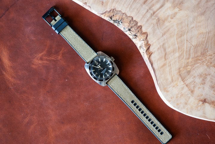 Canvas & Rubber: Durable rubber meets flexible canvas, ideal for outdoor activities. Features a sharp two-tone look with a black rubber strap and colored canvas top, tapered from 3.4mm at lugs to 2.8mm at the buckle. Secured with black sliding rubber keepers and a black PVD buckle (brushed option available), with double floating rubber keepers and quick-release pins.