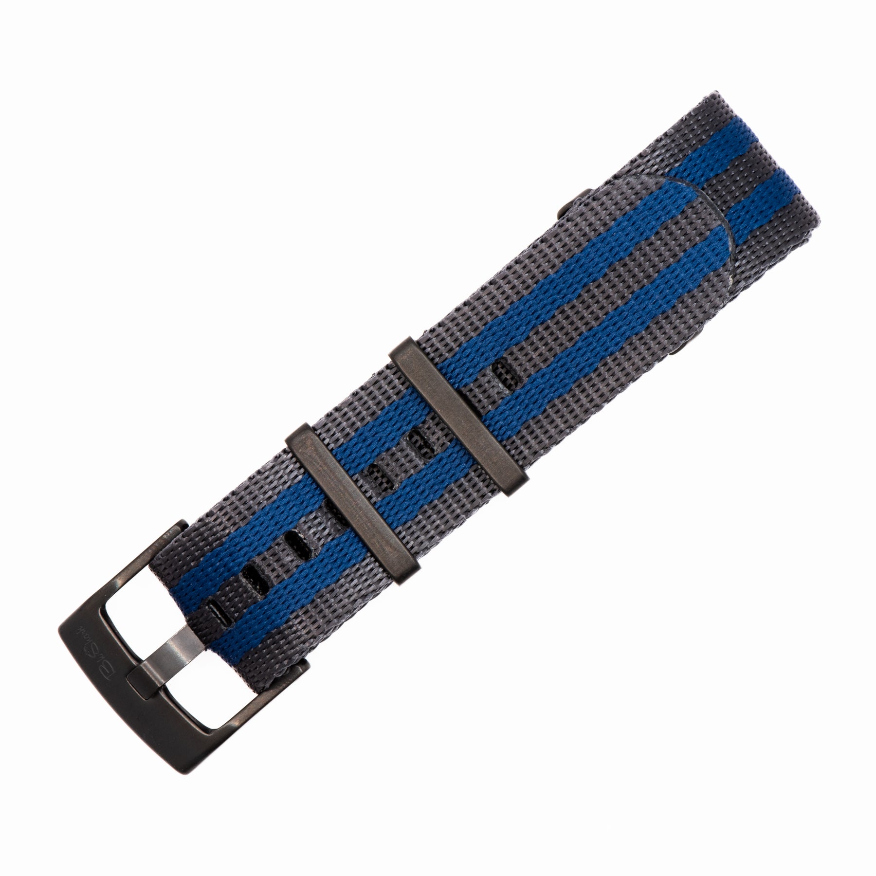 Our luxury nylon watch strap, AlphaShark, in the Bond striped pattern with navy and charcoal gray stripes. Crafted from high tensile strength "seat belt" nylon webbing with deluxe hardware, including a premium stainless steel buckle and flat stainless steel keepers. The nylon is weaved to provide a softer feel with a higher sheen than standard nylon straps. Superior to standard nylon straps, the AlphaShark, is comparable to far more expensive offerings.