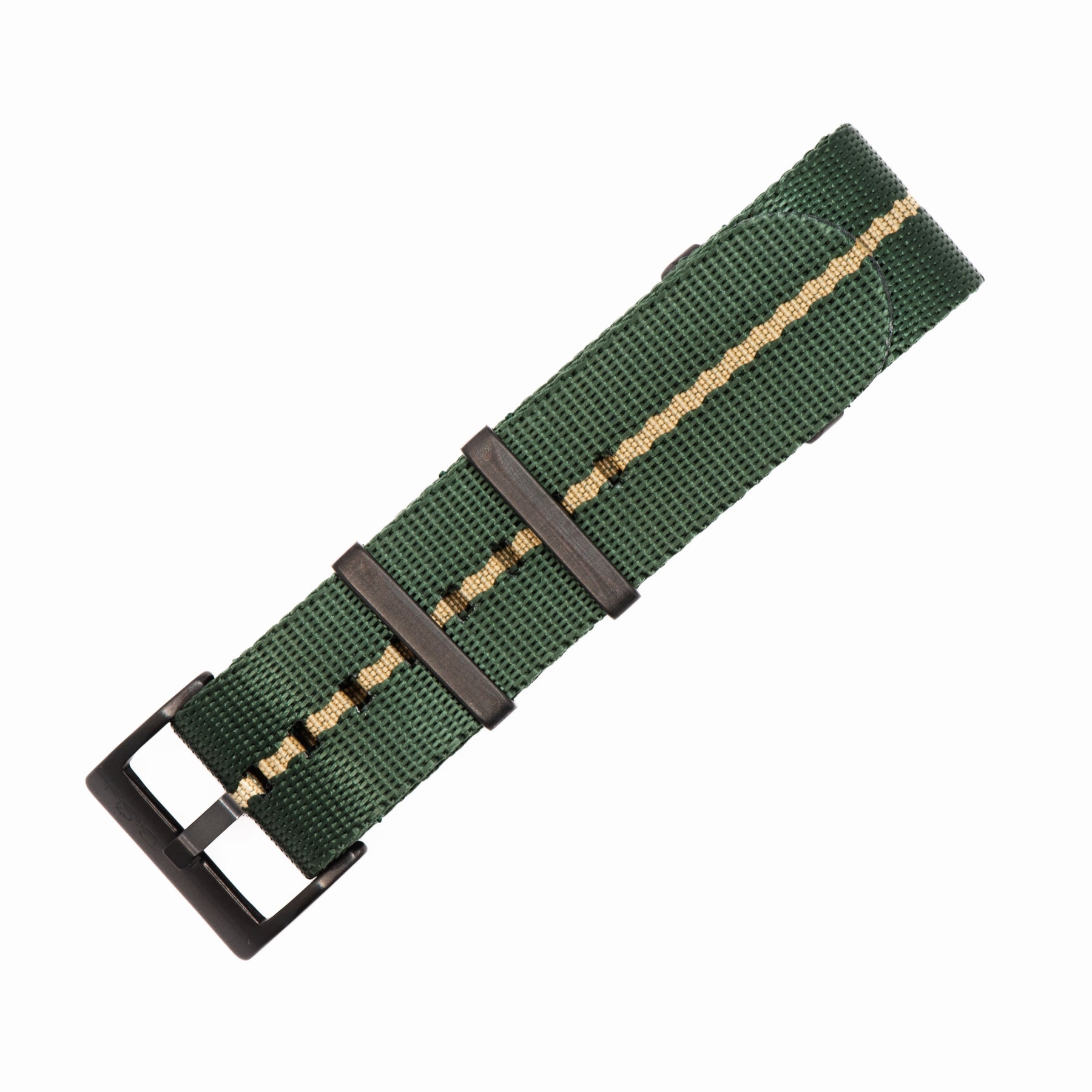 Our luxury nylon watch strap, AlphaShark - Emerald Boa, a rich emerald green with a yellow stripe. Crafted from high tensile strength "seat belt" nylon webbing with deluxe hardware, including a premium stainless steel buckle and flat stainless steel keepers. The nylon is weaved to provide a softer feel with a higher sheen than standard nylon straps. Superior to standard nylon straps, the AlphaShark, is comparable to far more expensive offerings.