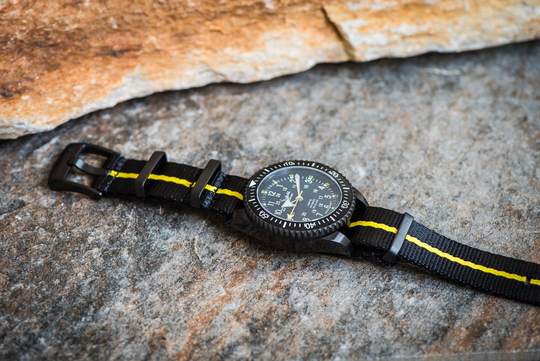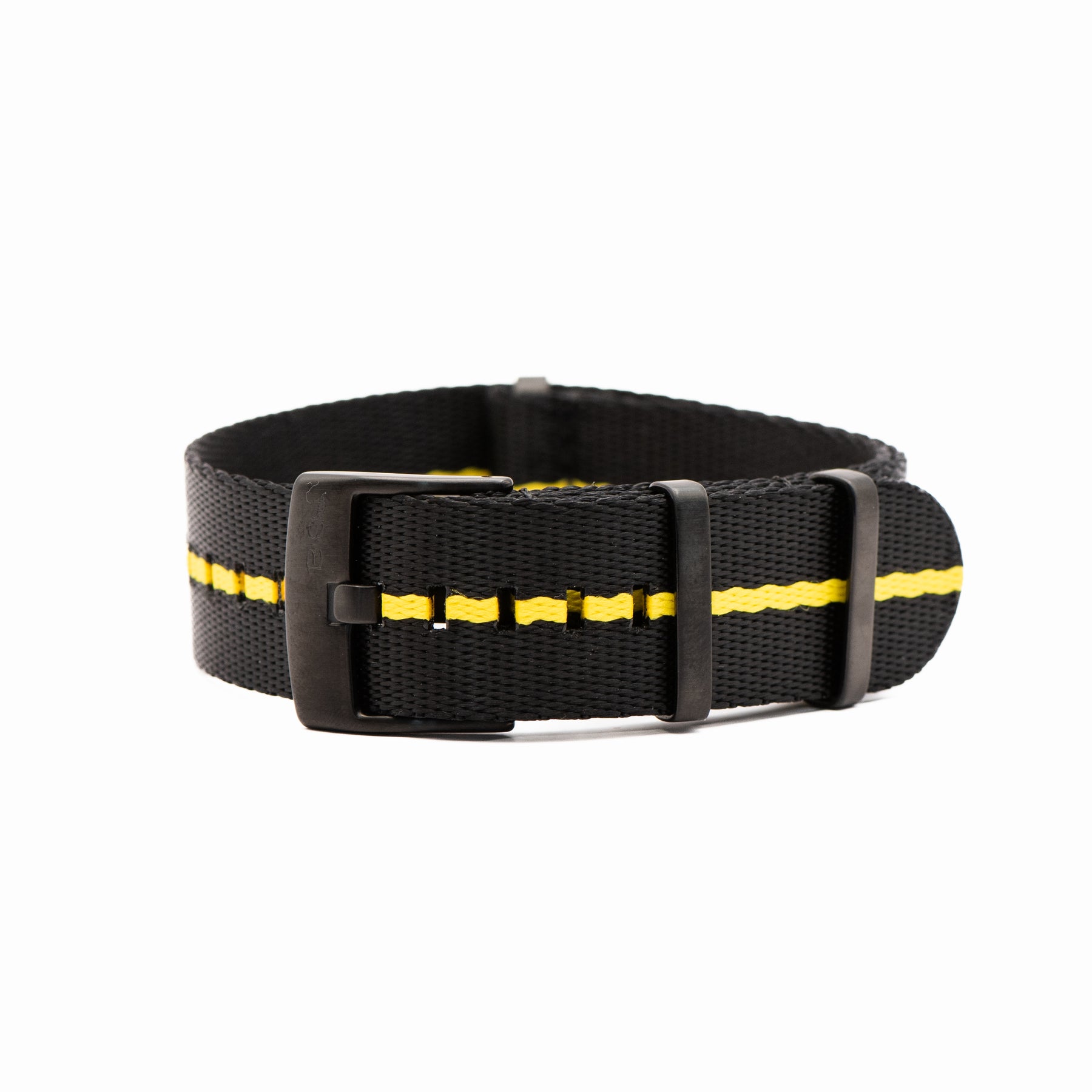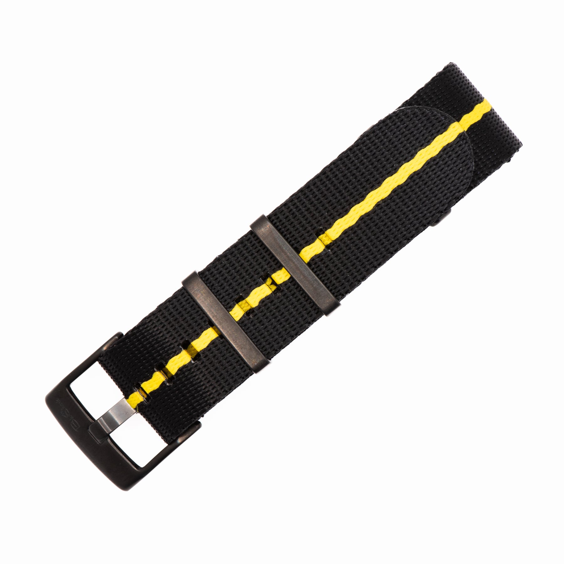 Our luxury nylon watch strap, AlphaShark, in black with a single yellow stripe. Crafted from high tensile strength "seat belt" nylon webbing with deluxe hardware, including a premium stainless steel buckle and flat stainless steel keepers. The nylon is weaved to provide a softer feel with a higher sheen than standard nylon straps. Superior to standard nylon straps, the AlphaShark, is comparable to far more expensive offerings.