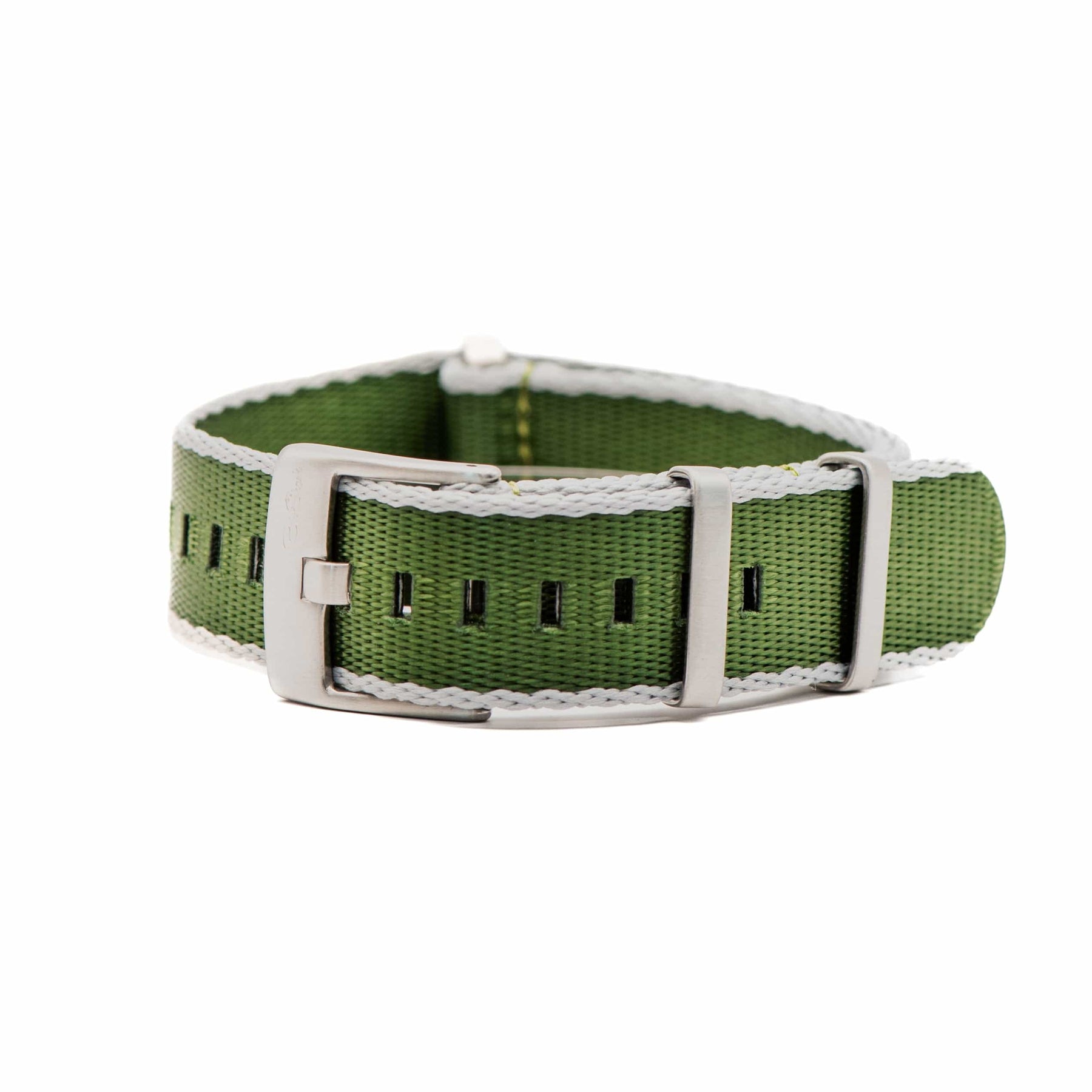 Our luxury nylon watch strap, AlphaShark, in green with silver piping. Crafted from high tensile strength nylon webbing with deluxe hardware, including a premium stainless steel buckle and flat stainless steel keepers. The nylon is weaved to provide a softer feel with a higher sheen than standard nylon straps. Superior to standard nylon straps, the AlphaShark, is comparable to far more expensive offerings.
