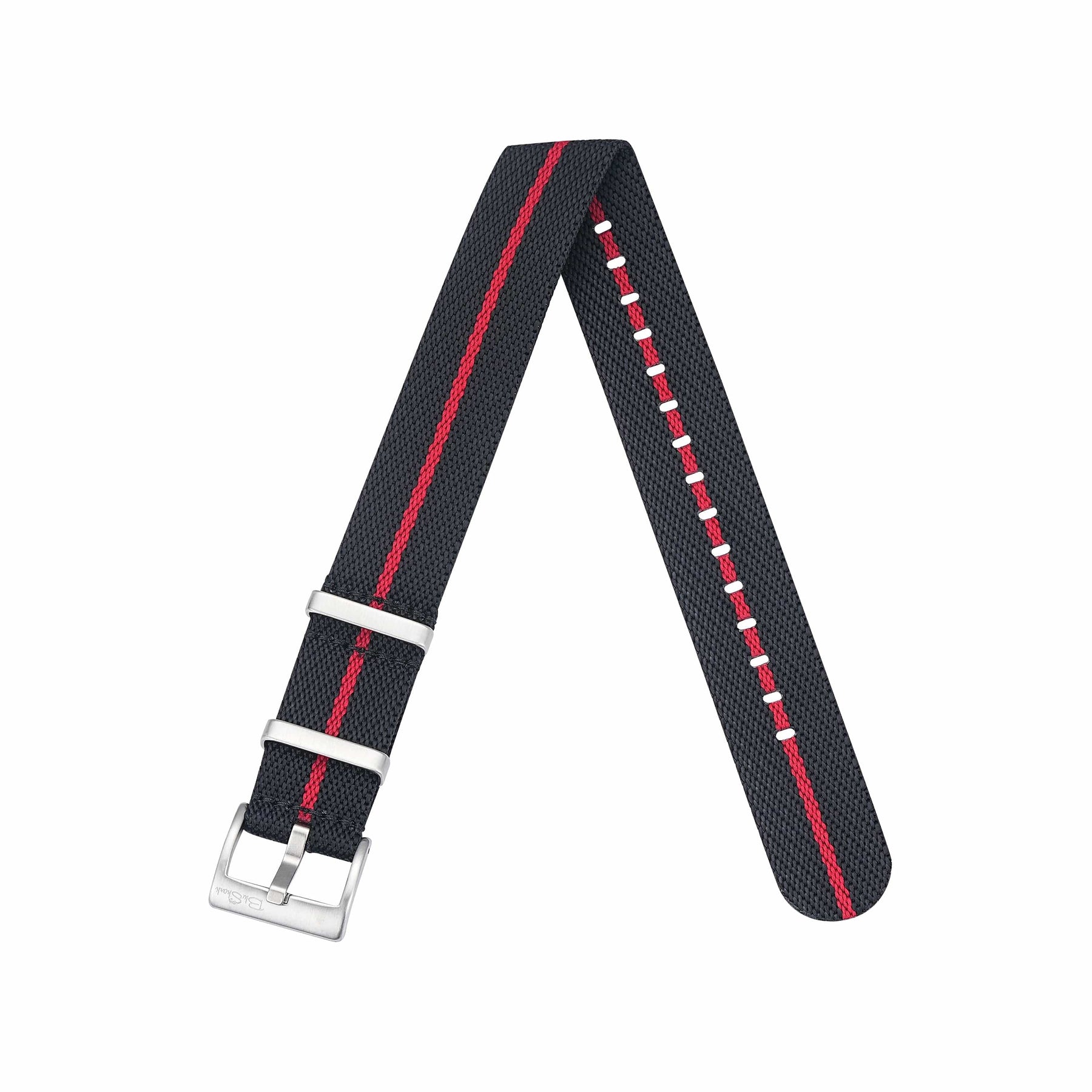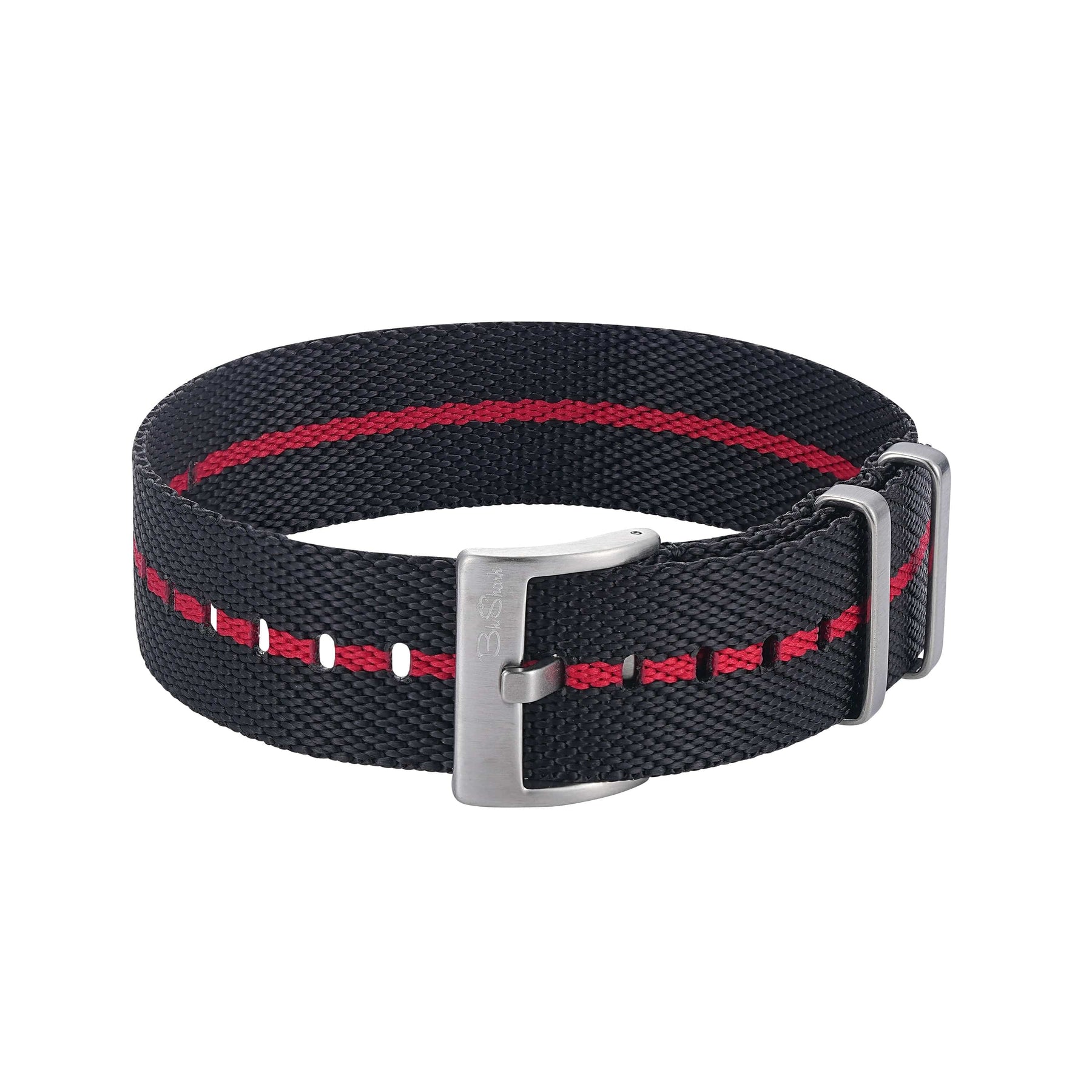 Color Details: The Black & Red style features a bold red center stripe, set against solid black edges in a diagonal twill weave throughout the strap. The interlacing pattern adds texture and depth, giving this strap a timeless, layered look.