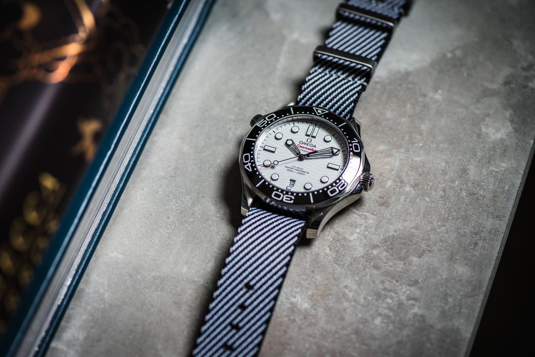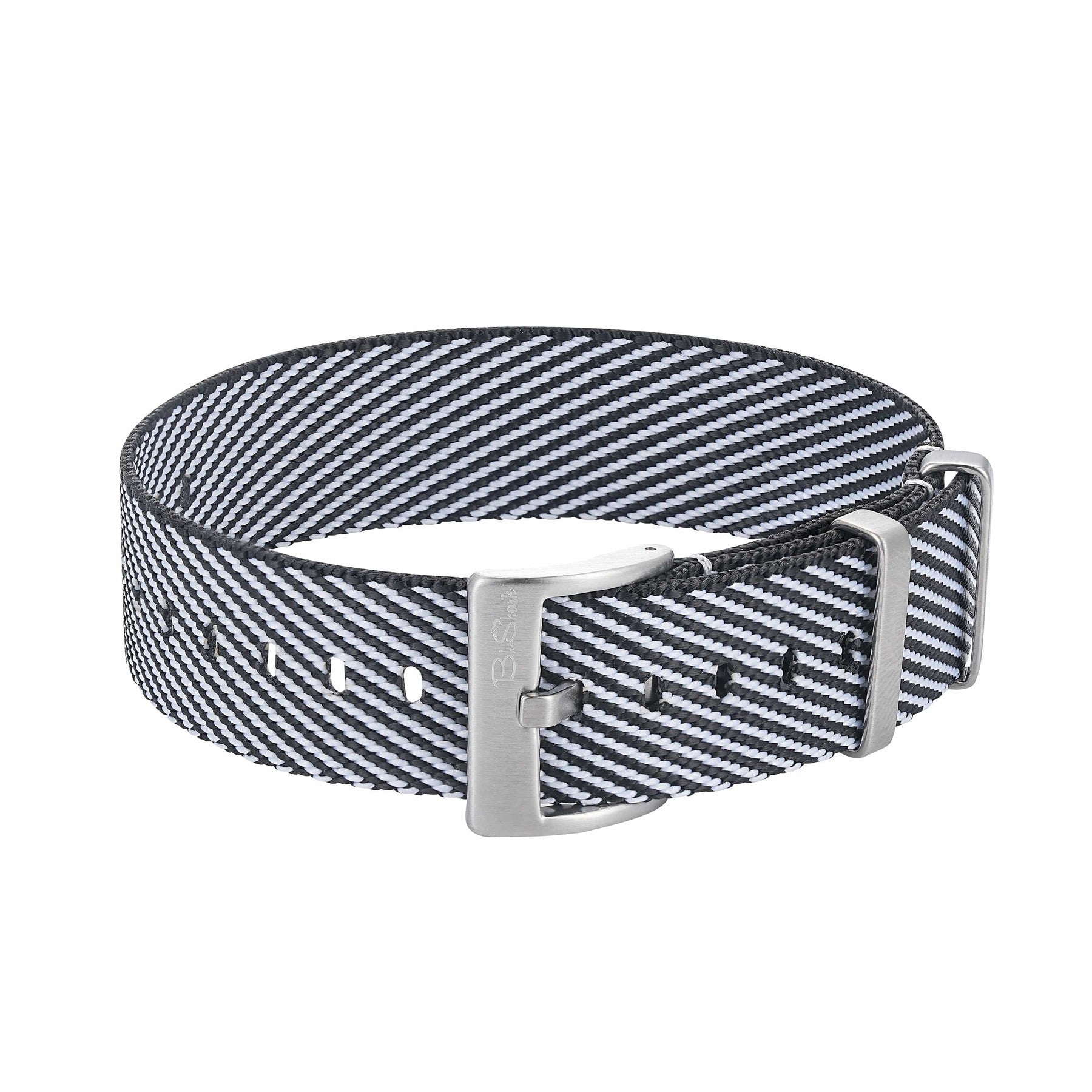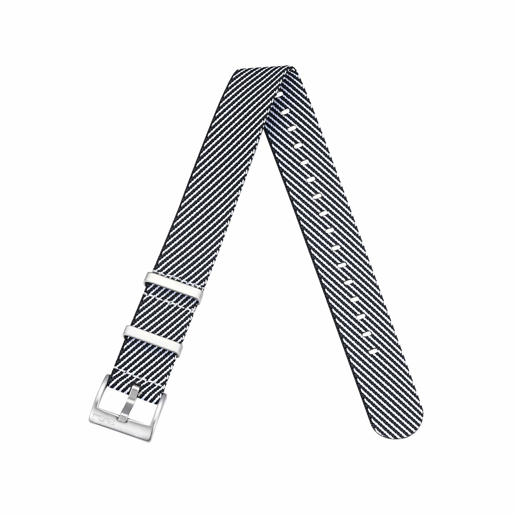 Color Details: The Pinstripe style features black and white diagonal stripes, with a unique design: one edge has a solid black stripe, while the other edge extends the diagonal twill pattern all the way to the strap’s edge. The interwoven pattern adds texture and depth, giving this strap a striking, layered look.