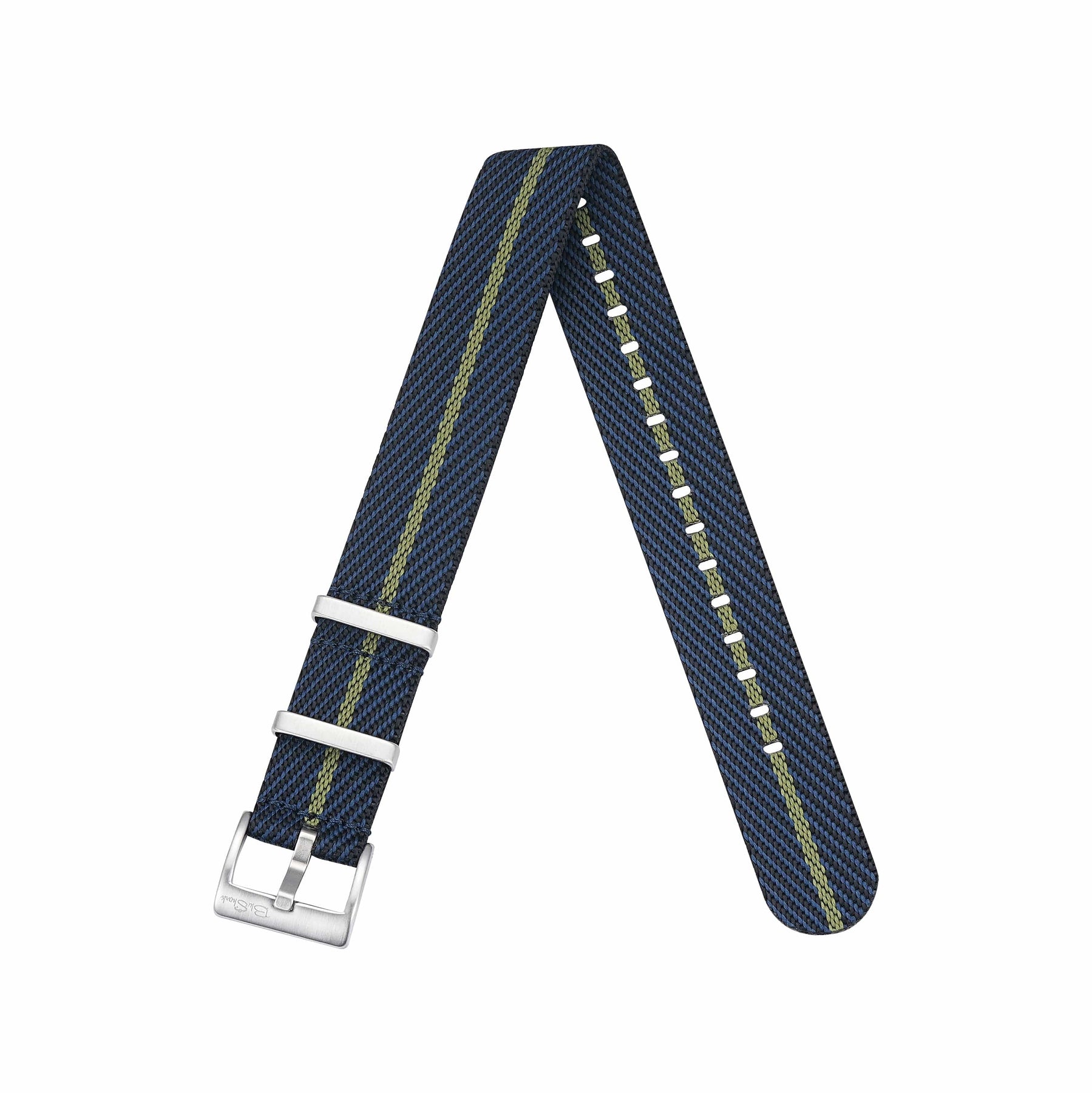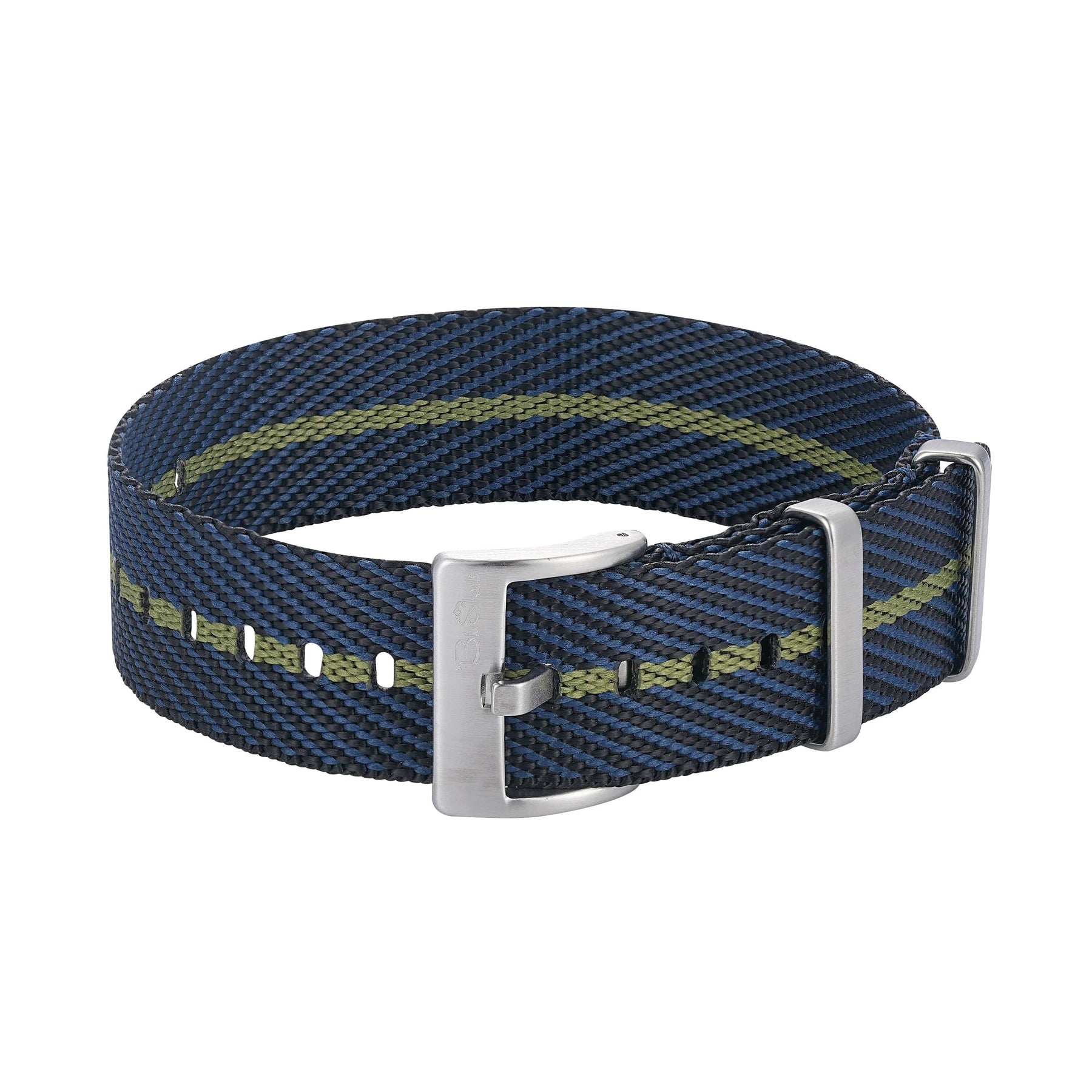 Color Details: The Space & Olive style features a single olive green center stripe, framed by outer edges of black and deep navy blue in a diagonal twill weave. Thanks to the twill pattern, the black subtly shows through the center stripe, giving this strap added depth.