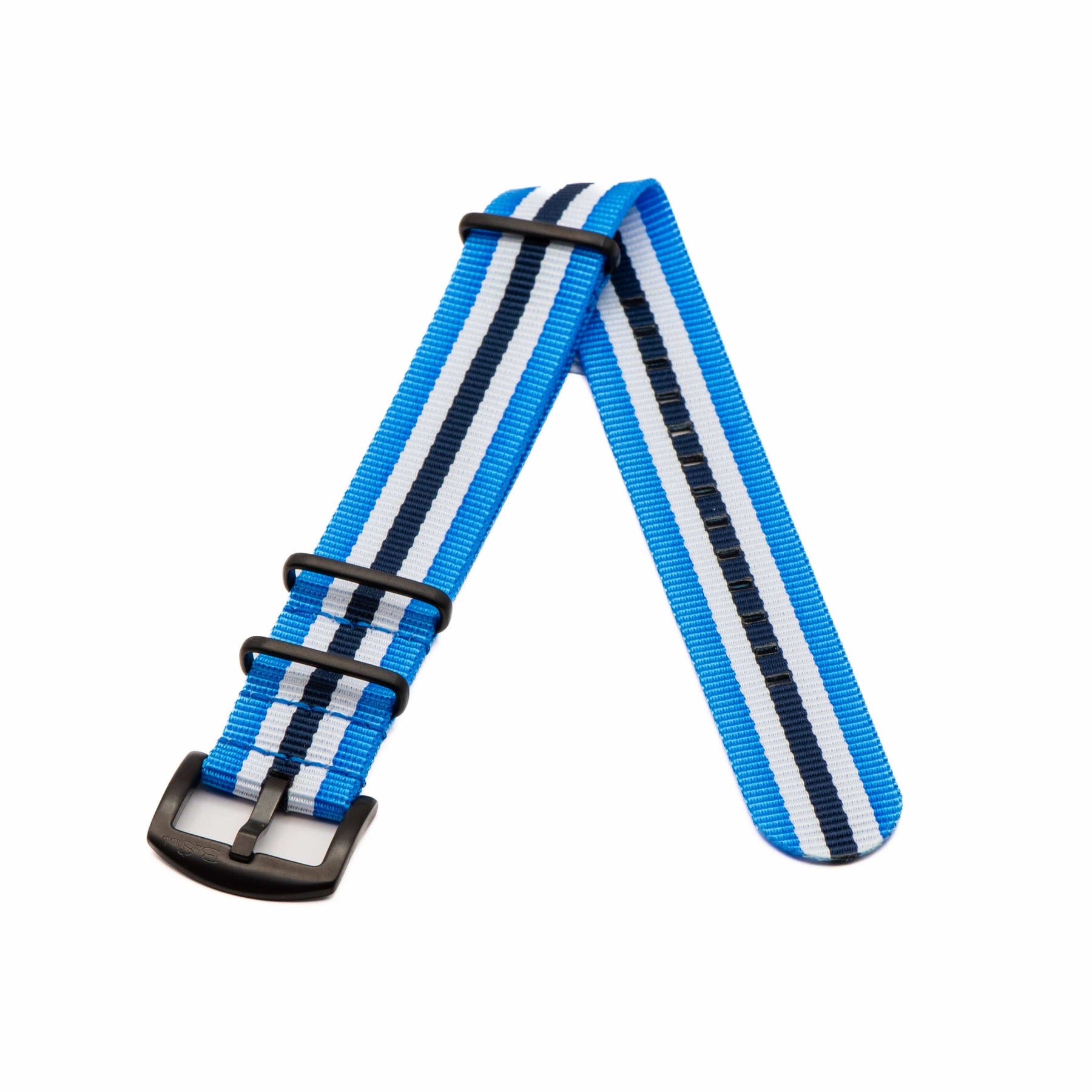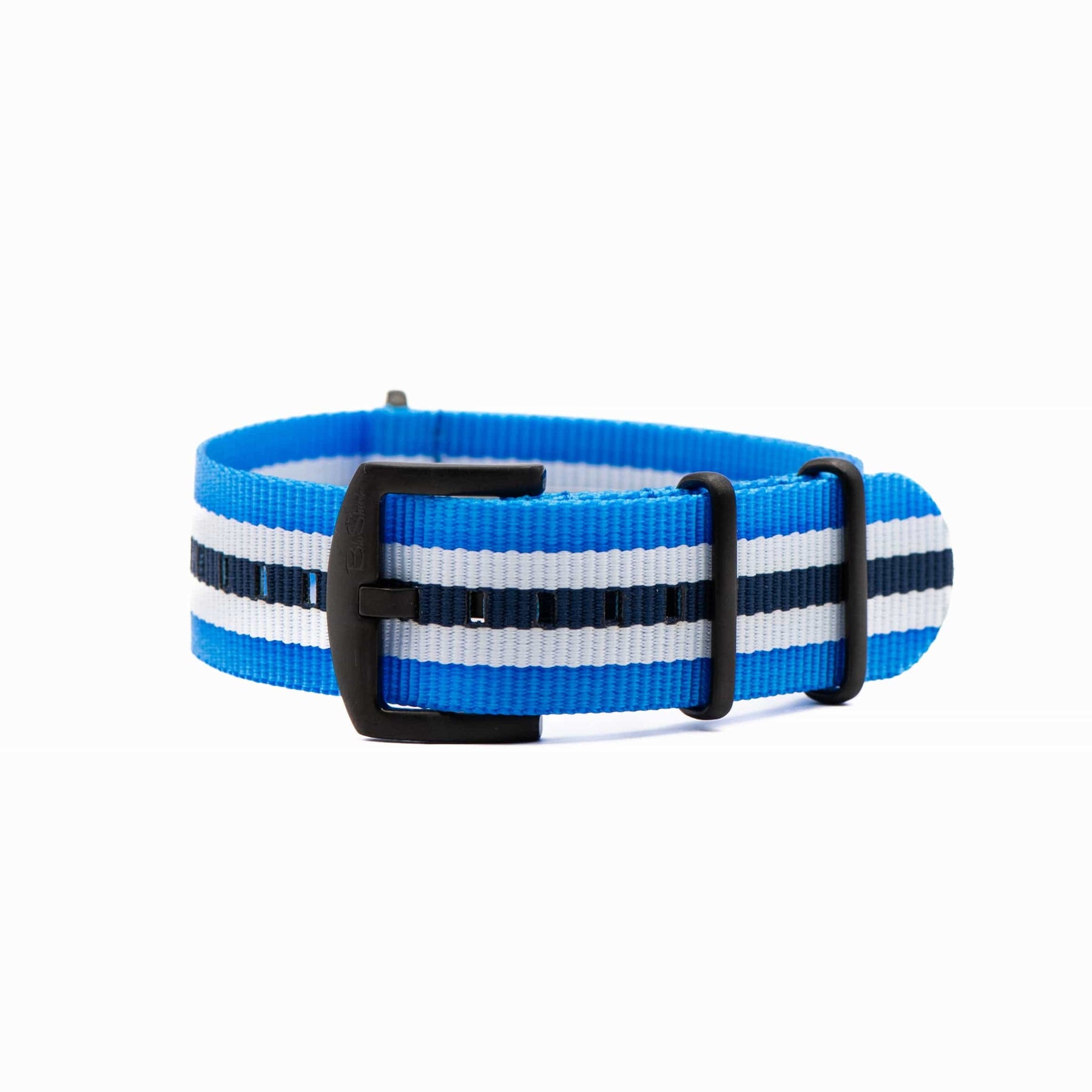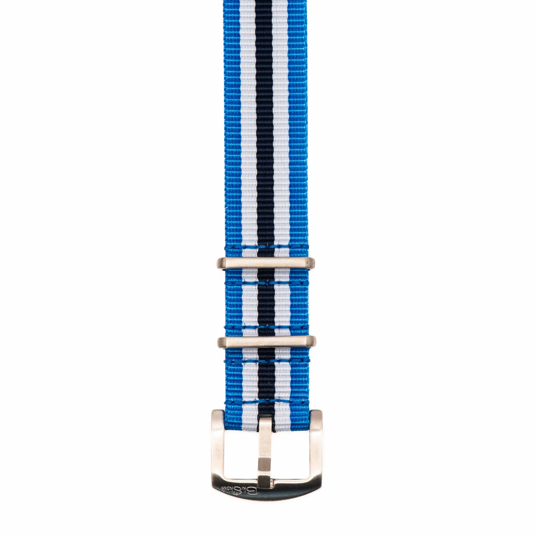 A new addition to the collection, the Original - Bond BluShark is a fun reimagining of the classic Bond watch strap design. Styled in BluShark blue with additional white and navy stripes, this strap will pair well with many different timepieces, especially dive watches. As with all BluShark straps, this one is made with high-grade ballistic nylon and stainless steel hardware. BluShark straps are clean-stitched unless otherwise noted.