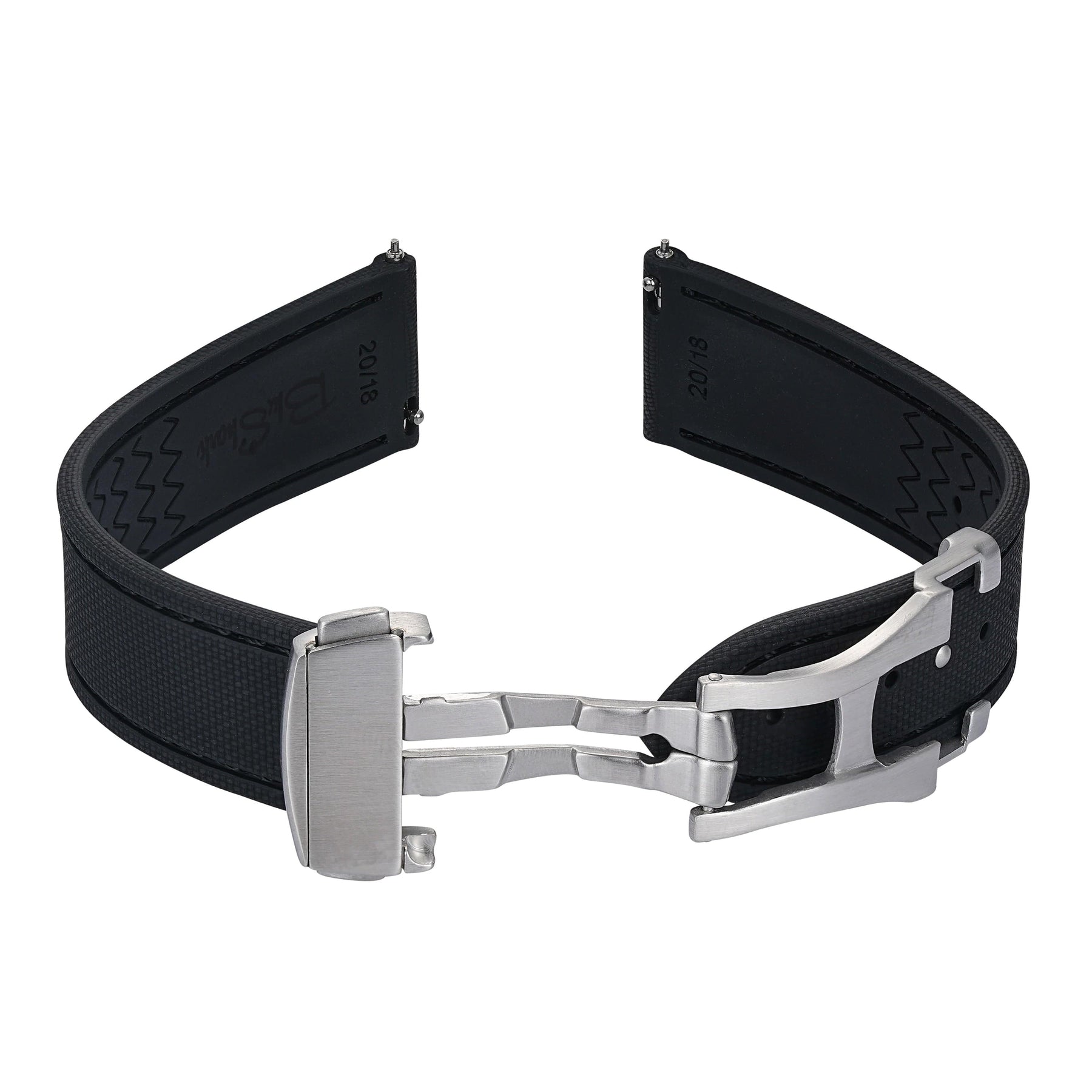 The deployment clasp offers a nearly seamless fit, letting you pop your watch on and off effortlessly, no more struggling with buckles or tucking the tail under keepers. Quick-release spring bars make swapping straps faster than ever, letting you install or remove the strap without any tools, effortlessly changing up the look of your watch day to day. Soft, durable, and breathable, the FKM Rubber backing keeps your wrist comfortable while maintaining a refined, sporty look.