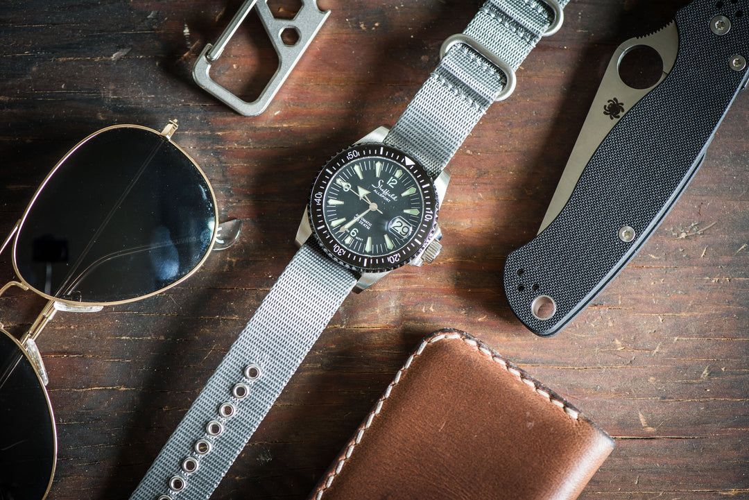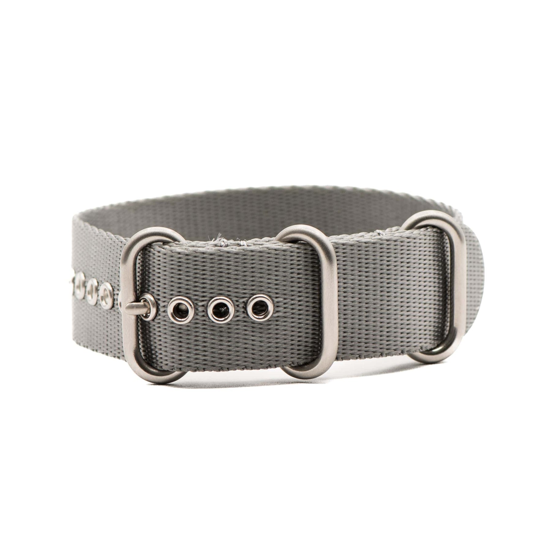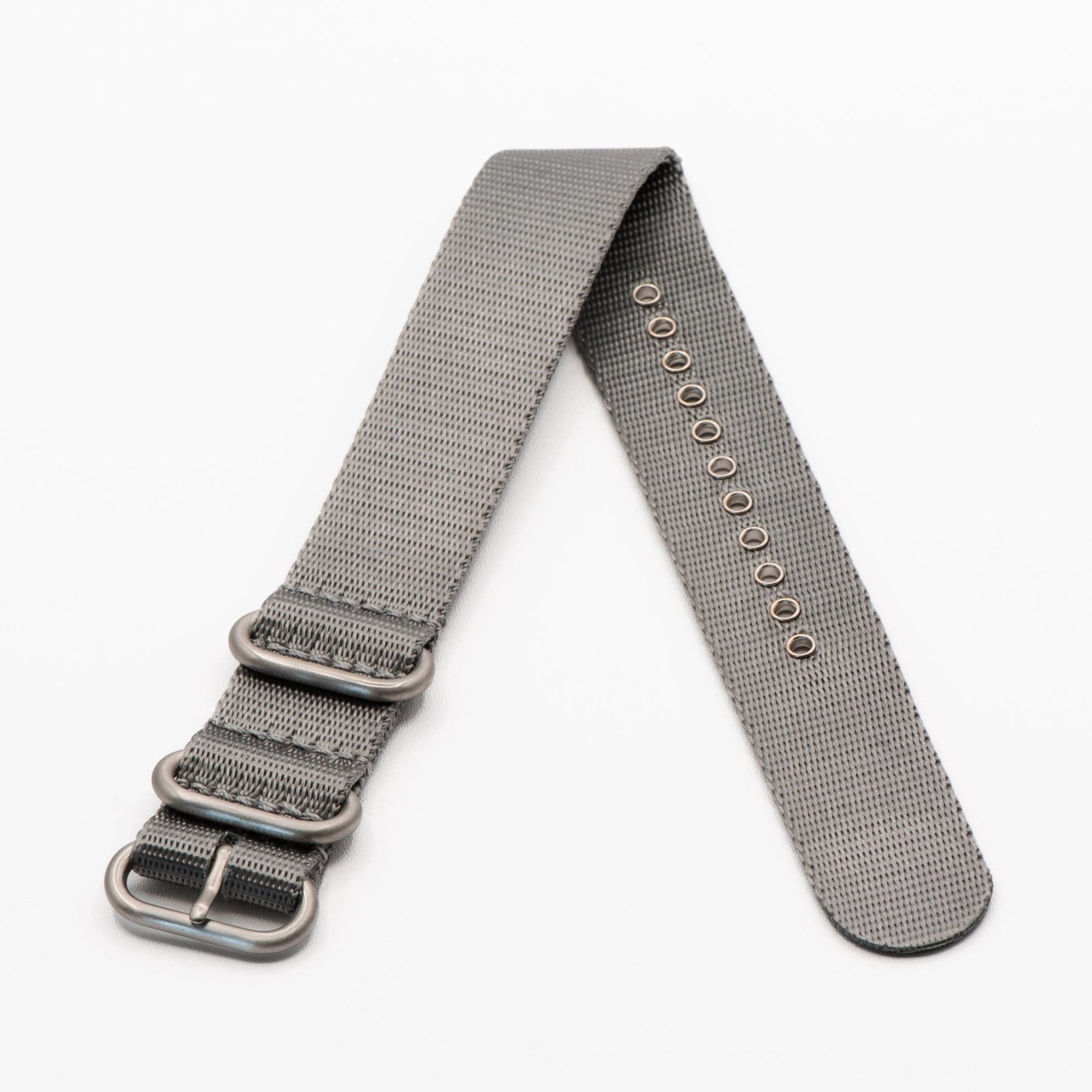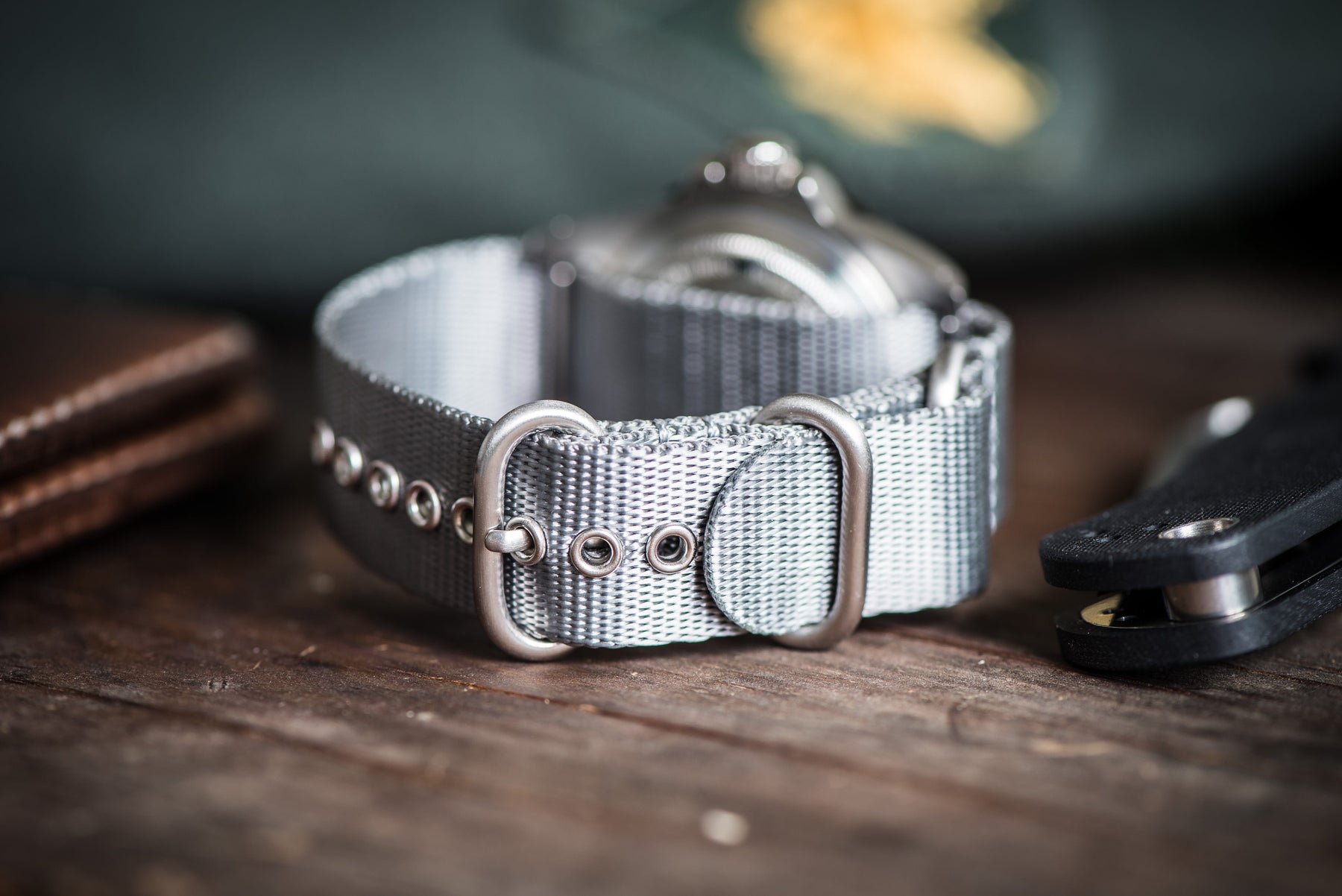 The strap itself is made from our AlphaShark nylon which features 1.4mm thick high tensile strength "seat belt" webbing. Steel ring buckle and keepers are double-stitched on the strap resulting in a never-fail construction. Strap holes are reinforced with metal grommets for a durable connection. It's our most rugged and durable strap yet - we can't wait for you to try it out and put it to the test.