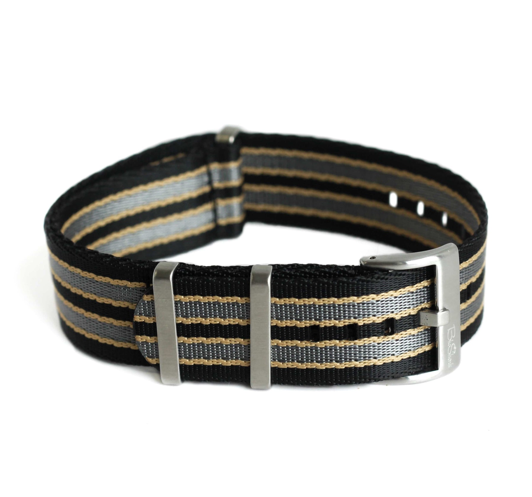 Our luxury nylon watch strap, AlphaShark - Bond 2021, is stylized after the latest Bond watch. It features an elegant black, gray, and tan color scheme. Crafted from high tensile strength "seat belt" nylon webbing with deluxe hardware, including a premium stainless steel buckle and flat stainless steel keepers. The nylon is weaved to provide a softer feel with a higher sheen than standard nylon straps. Superior to standard nylon straps, the AlphaShark, is comparable to far more expensive offerings.