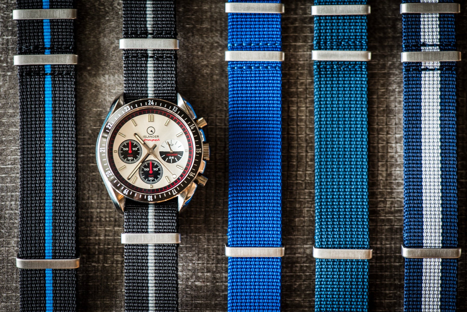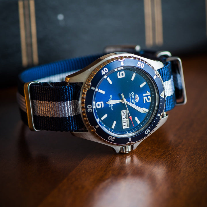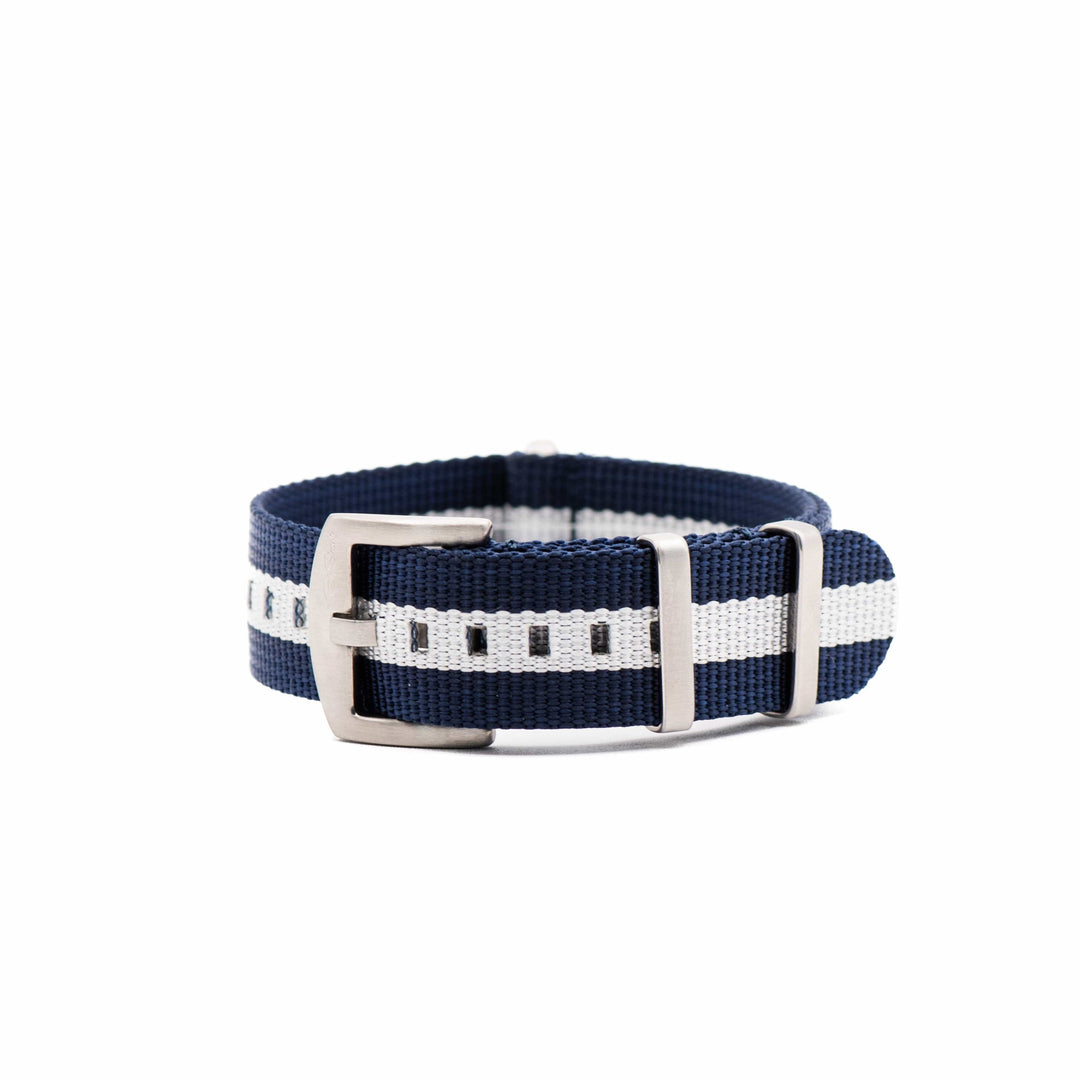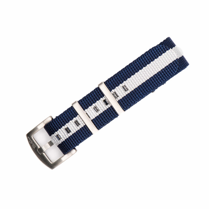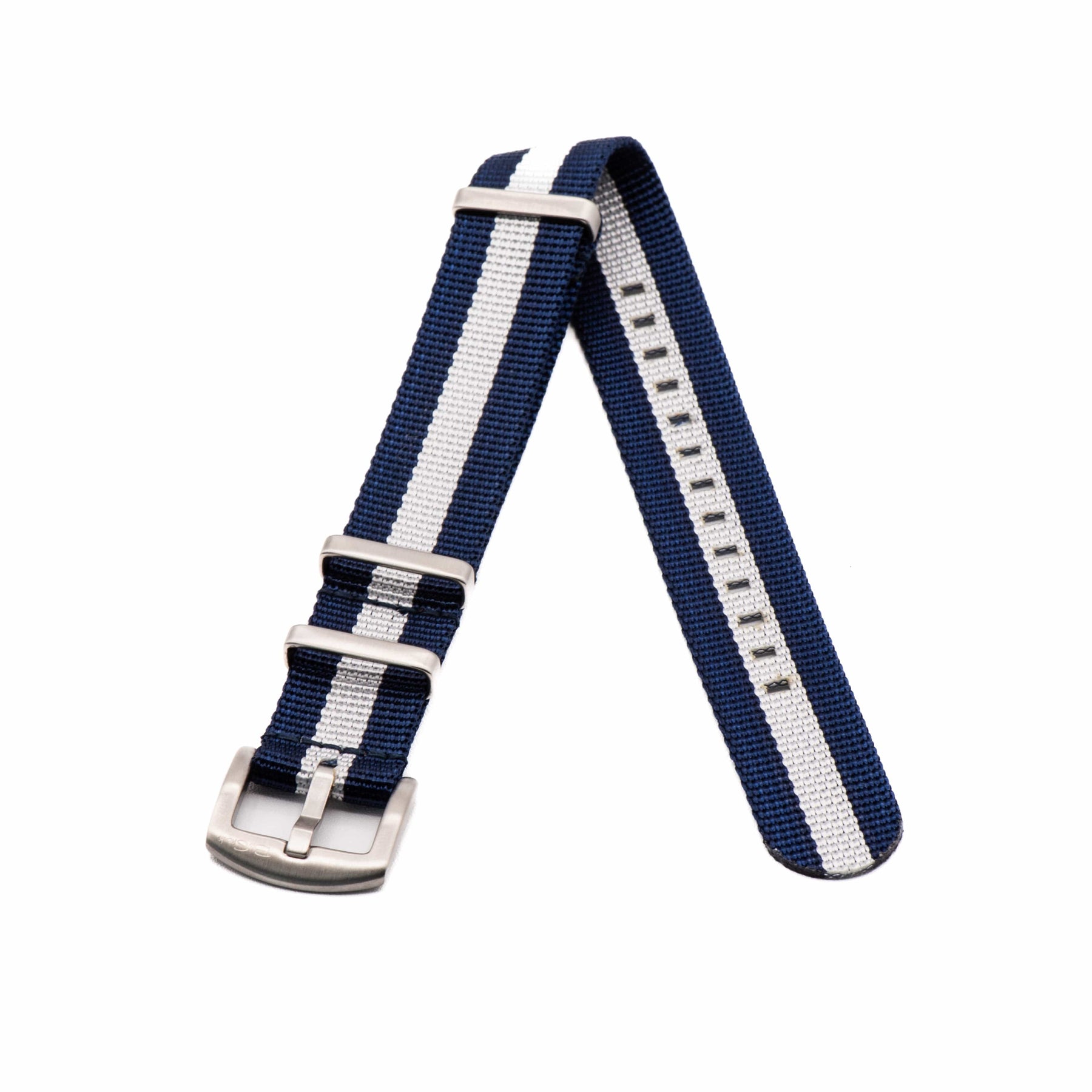 A simple and versatile look, the Orca Tide strap is navy blue and white-silver striped. We now offer this style in our Orca collection of thick straps. As with all BluShark straps, this one is made with high-grade ballistic nylon and stainless steel hardware. BluShark straps are clean-stitched unless otherwise noted.