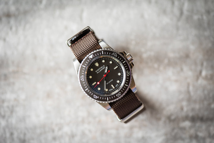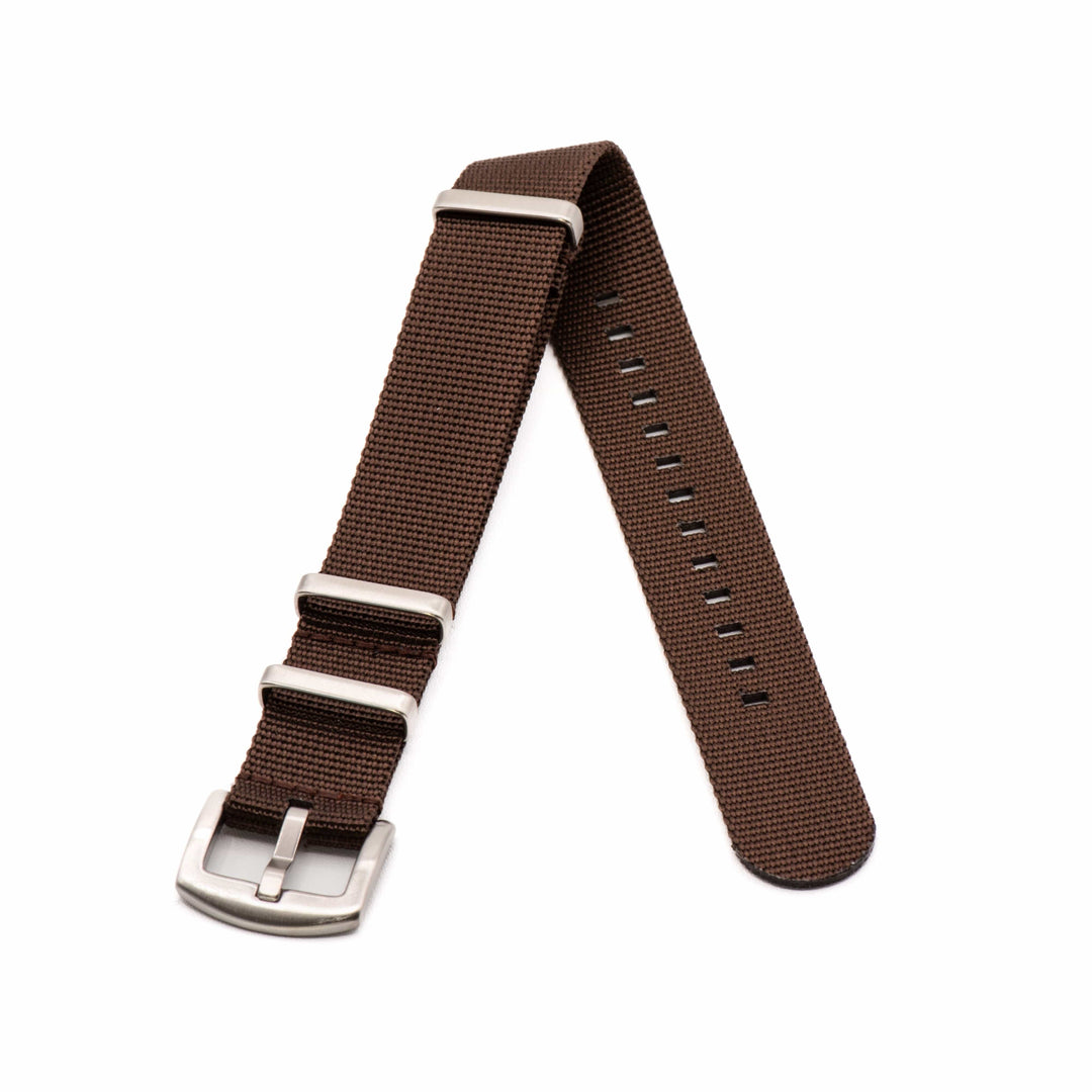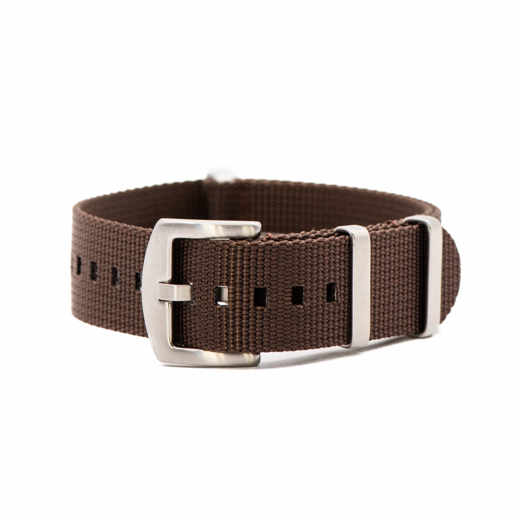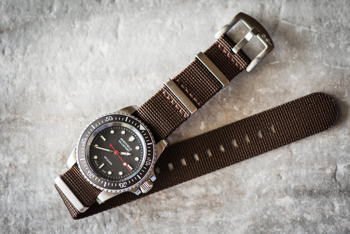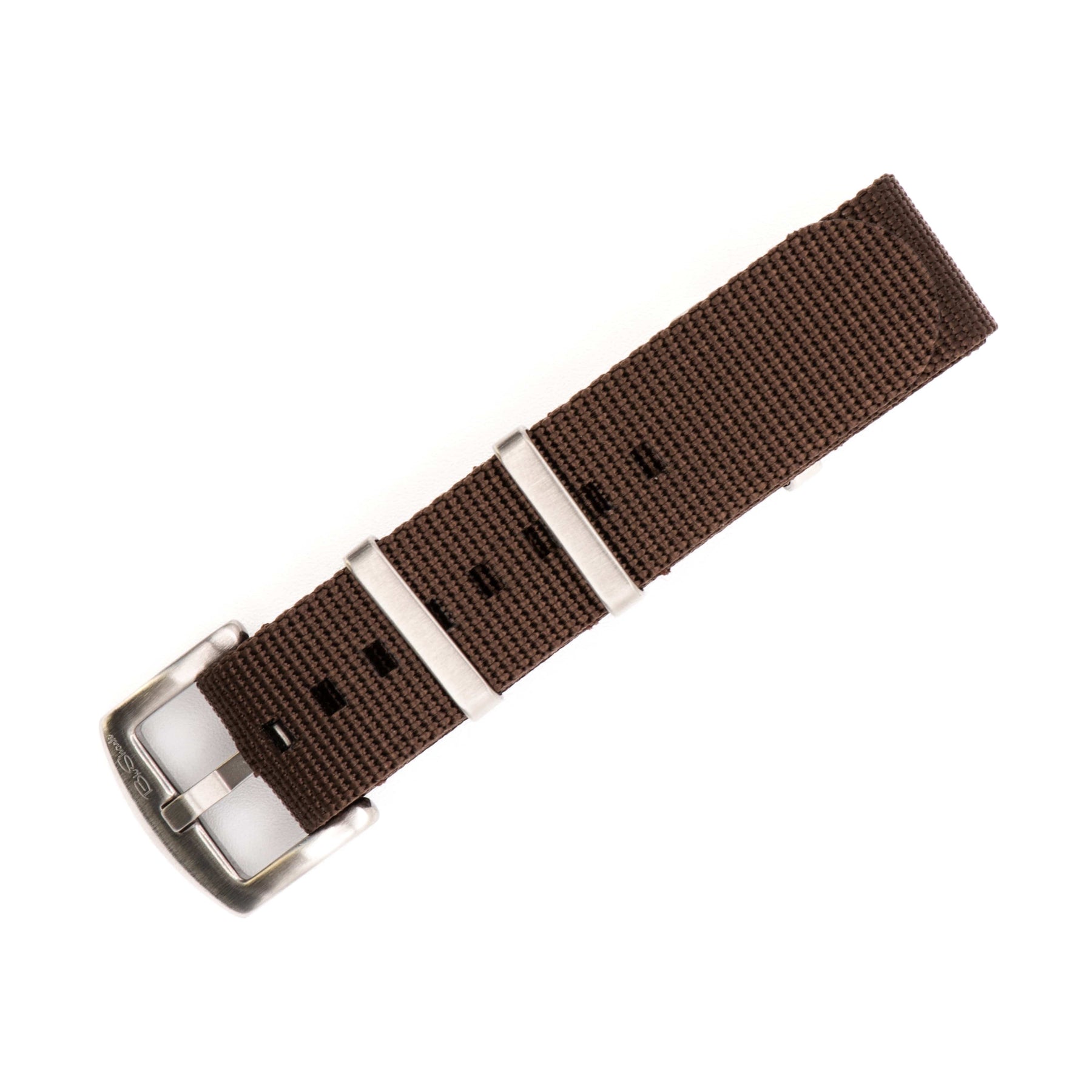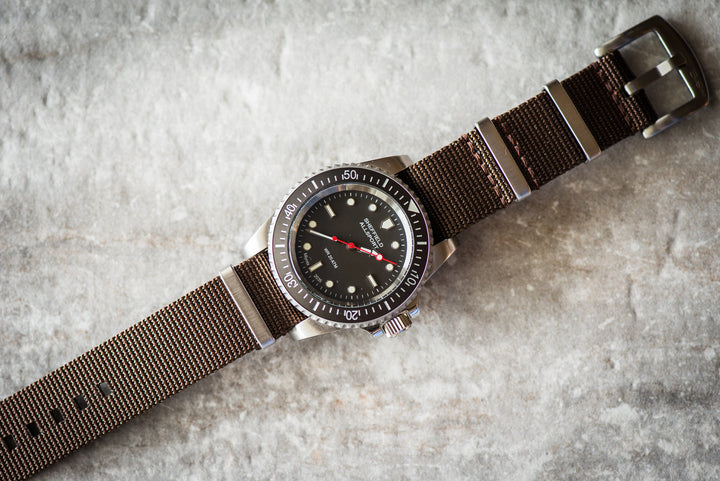 The Chocolate Orca strap is a very dark shade of brown and looks great with a variety of watch styles, especially lighter colored dials and/or bronze accented watches. As with all Orca straps, this one is made with thick 1.5mm high-grade ballistic nylon and stainless steel hardware. All BluShark straps are cleanly stitched around stainless steel hardware.