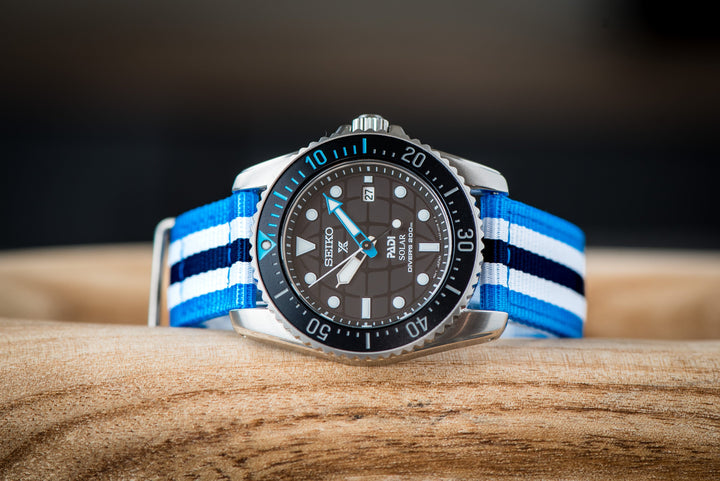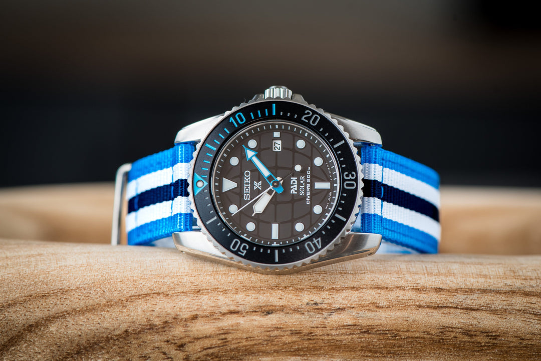 Bond BluShark: A dynamic strap with bright blue, white, and black stripes that bring a lively, modern edge to any watch. It pairs effortlessly with dials in black, white, gray, or even additional shades of blue for a bold and coordinated look.