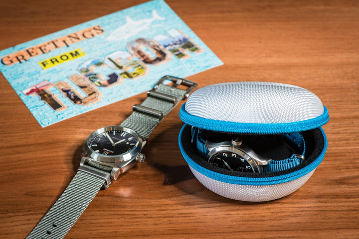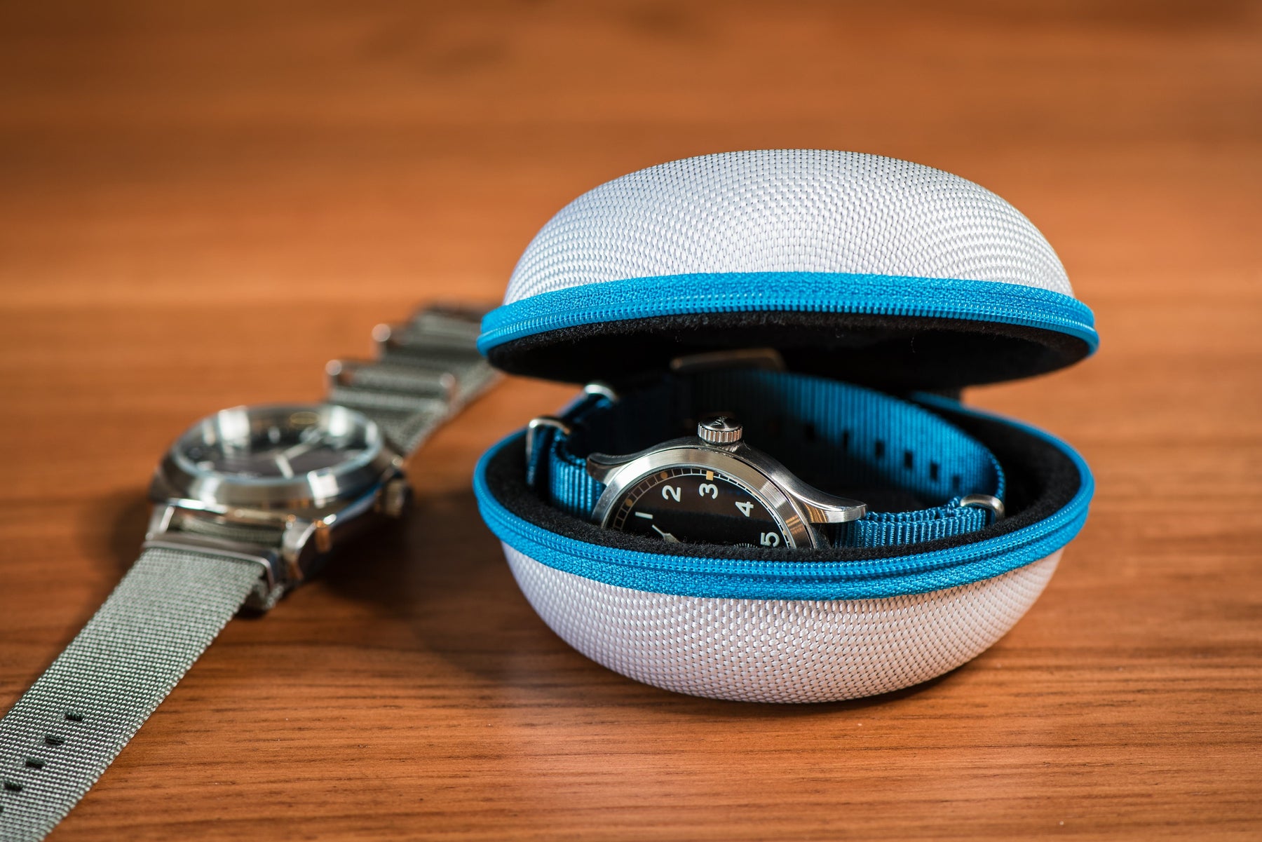 Limited Edition! The Pod - Travel Watch Case makes it fun and easy to store and transport your prized timepiece without having to worry about dust, dirt, or damage. The exterior is a rigid, reinforced shell covered with a protective blue mesh fabric, while the inside is lined in micro-suede cloth to avoid scratching. Take The Pod - Travel Watch Case with you and your favorite watch wherever you go!